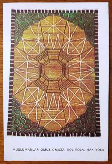 HEDİYE KARTPOSTALI, TÜRK EL DOKUMACILIĞI HALI VE KİLİM DESENLERİ, OSMANLI TARZININ YANSIMASI VE ''MÜSLÜMANLAR OMUZ OMUZA, KOL KOLA, HAK YOLA'' YAZILI NOTU, ARKASI YAZILMAMIŞ, RENKLİ, 11 X 16 CM EBADINDA - 1940'LAR, 1950'LER, 1960'LAR, 1970'LER 1980'LER, en son 8 ay önce güncellenmiştir.