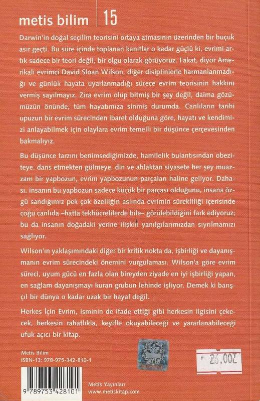 HERKES İÇİN EVRİM / DARWIN'İN TEORİSİ HAYATA BAKIŞ AÇIMIZI NASIL DEĞİŞTİRİR?, DAVID SLOAN WILSON tarafından kaleme alınmıştır. Kitap 2011 yılında METİS YAYINLARI tarafından [İSTANBUL] yayınlanmıştır. Bu baskının çevirisi GÜROL KOCA tarafından yapılmıştır. 385 sayfadır. HERKES İÇİN EVRİM / DARWIN'İN TEORİSİ HAYATA BAKIŞ AÇIMIZI NASIL DEĞİŞTİRİR? adlı eser Türkçe dilindedir.