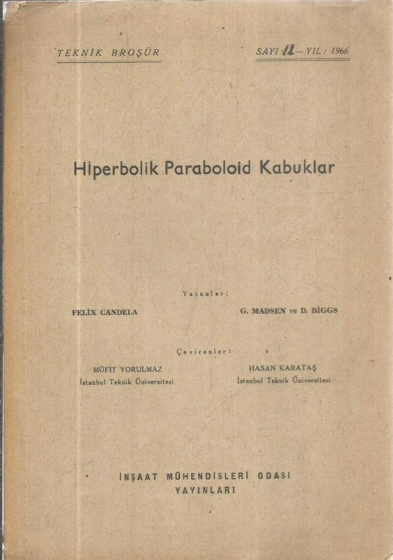 HİPERBOLİK PARABOLOİD KABUKLAR, FELİX CANDELA-G.MADSEN-D.BIGGS tarafından kaleme alınmıştır. Kitap 1966 yılında İNŞAAT MÜHENDİSLERİ ODASI YAYINLARI tarafından [İSTANBUL] yayınlanmıştır. 40 sayfadır. HİPERBOLİK PARABOLOİD KABUKLAR adlı eser Türkçe dilindedir.