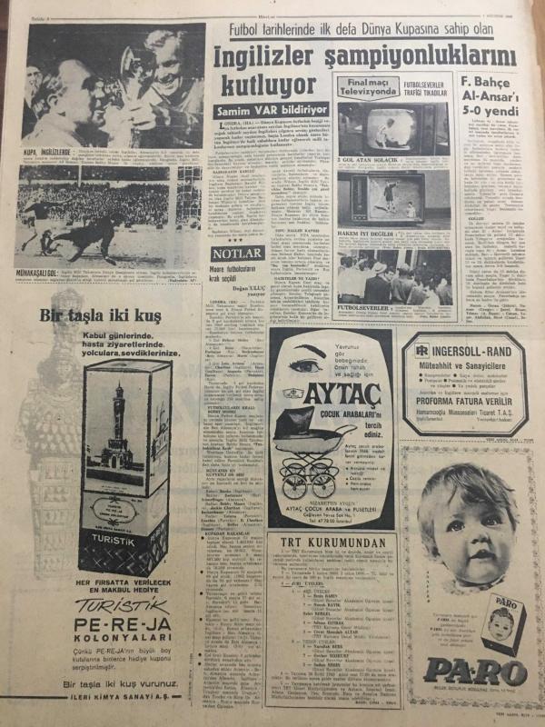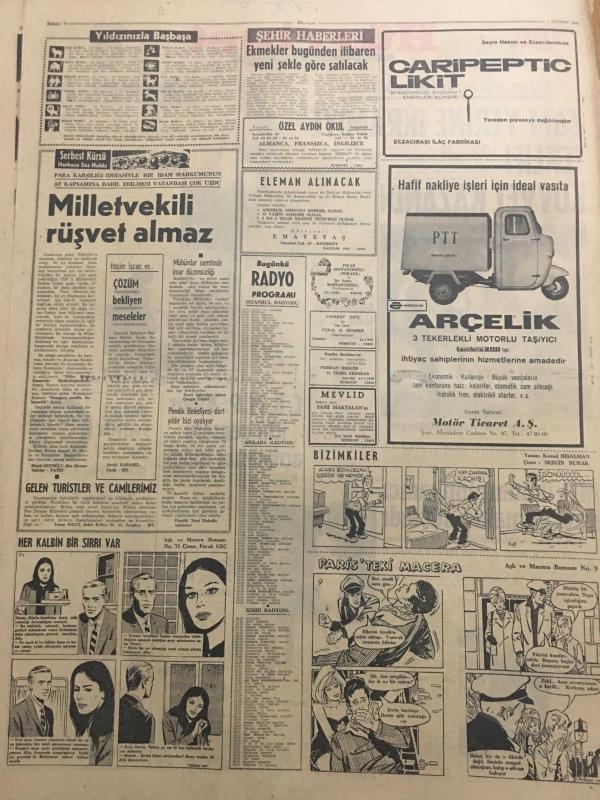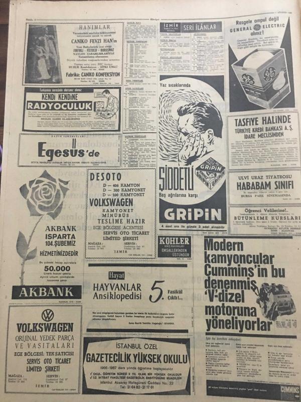HÜRRİYET GAZETESİ 1 AĞUSTOS 1966 YIL :19 SAYI :6557----Zam yerine ikramiye teklifi kuvvet kazandı --Af Kanunu Görüşülecek Olan Senato dün de Toplanamadı ---CKMP Kıbrıs için gensoru açılmasını istedi --MP iktidarı intikamcı davranmakla suçladı ---Emekler bugünden itibaren yeni şekle göre satılacak ---Radyo Programları ---Bir milyonerin idare ettiği şebeke yakalandı ----Reşat Aksan :İdare meclis azası , Ahmed Dallı : İdare meclis azası ,Nejat Eczacıbaşı :İdare meclis azası ,Vehbi Koç : İdare meclis azası , Bedi Yazıcı :İdare meclis başkanı ,: Tam hayat sigortanın kurucuları ve yöneticileri Türk ve yabancı iş aleminde daima en ön safları işgal etmiş halka ve memlekete faydalı olmak gayesiyle çalışan güvenebileceğimiz kimselerdir ----İngilizler şampiyonluklarını kutluyor ---Anlaşıp sevişmek için Türkçe öğreniyor ---Oto -stopla yurduna gidiyor ----Bazzaz ile Molla Barzani ,Rusya da Görüşecekler --- Yıpranma, sararmalar, kupon kesiği ve yırtılmalar zamana bağlı olarak görülebilir.