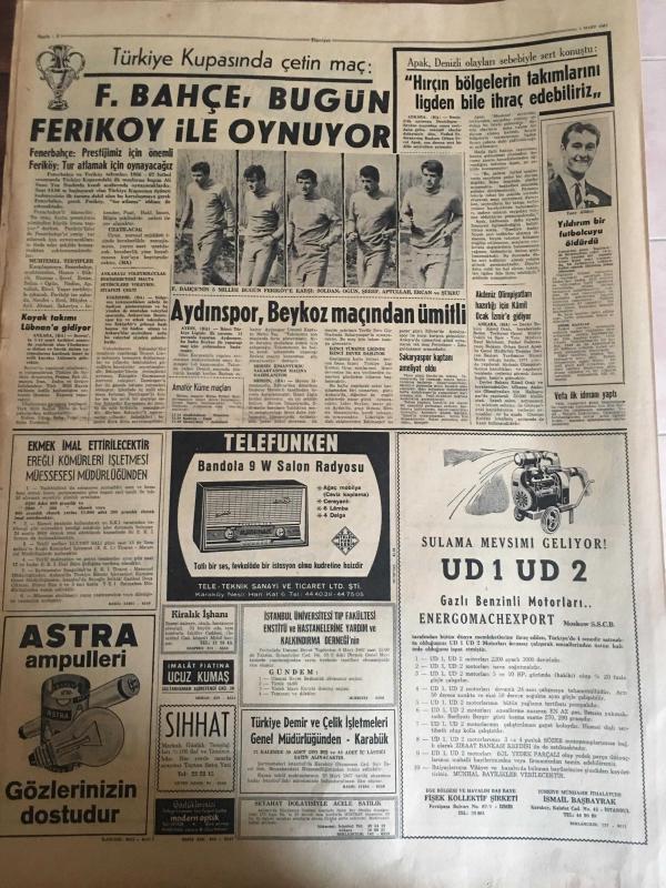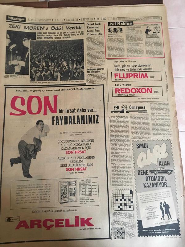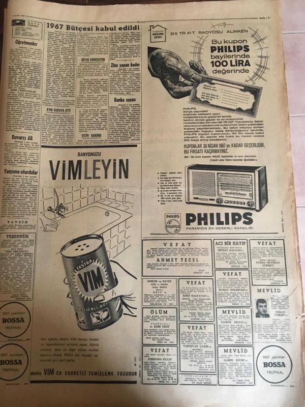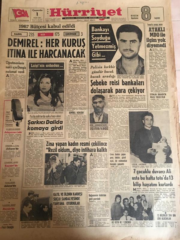 HÜRRİYET GAZETESİ 1 MART 1967 YIL :19 SAYI :6767---Demirel :Her kuruş itina ile harcanacak --Şarkıcı Dalida komaya girdi --Şebeke reisi bankaları dolaşarak para çekiyor --Ataklı MDO ile ilgim yok diyemedi ---Zina yapan kadın resmi çekilince rezil oldum diye intihara kalktı ---7 Çocuklu duvarcı Ali usta bu hafta toto da 13 bilip hayatını kurtardı --Katil ve ölenin kardeşi suçlu sandalyesinde yan yana oturdular ---Zeki Müren e ödül verildi --Sovyet balık konservesi gemisi battı 43 denizci öldü ---Fuar Göl Gazinosu Sanatçılar ---Muhammed Ali kendine aşıktır ---Fenerbahçe ,Bugün Feriköy ile oynuyor ---Aydınspor ,Beykoz maçından ümitli --Hırçın bölgelerin takımlarını ligden bile ihraç edebiliriz --22 km dizleri üzerinde yürüyüp dünya emekleme rekorunu kırdı --14 Yıldır temizlediği odaya yerleşti --Aktör George Raft İngiltere ye giremedi -- Yıpranma, sararmalar, kupon kesiği ve yırtılmalar zamana bağlı olarak görülebilir.