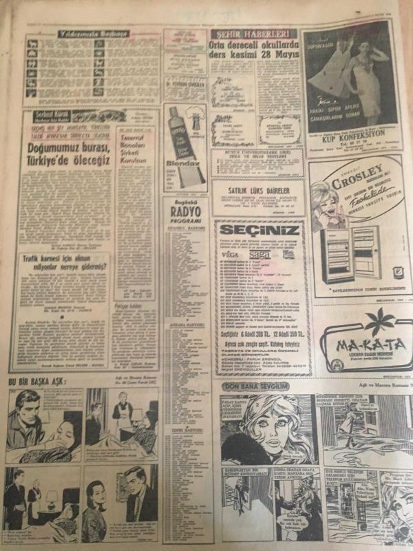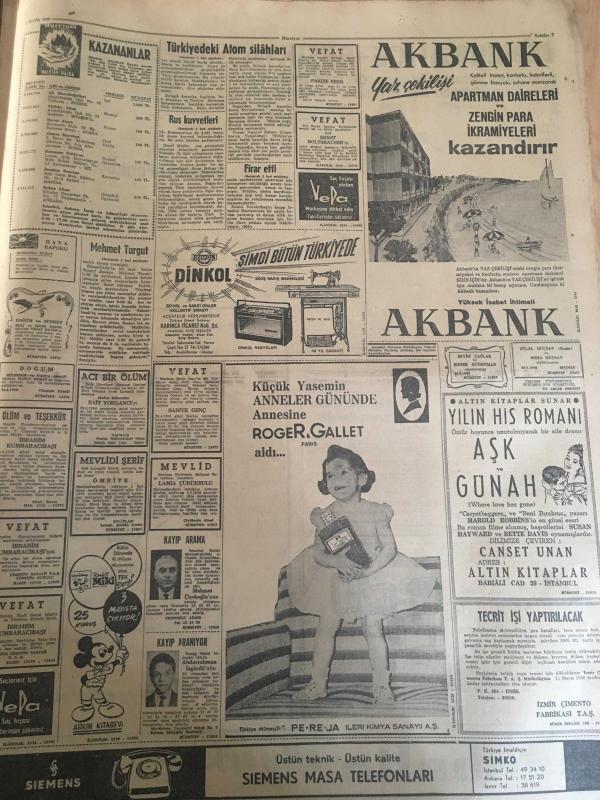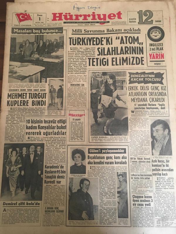 HÜRRİYET GAZETESİ 1 MAYIS 1966 YIL :19 SAYI:6465--Mehmet Turgut Küplere Bindi --Türkiye de Atom Silahlarının Tetiği Elimizde ---10 Kişinin tecavüz ettiği kadını Konyalılar buket vererek uğurladılar ---Karadeniz de Rusların 95 Bin Tonajlık Deniz Kuvveti Var --Erkek delisi genç kız Atlantiğin ortasında meydana çıkarıldı --Bıçaklanan genç kanı aka aka kendini vuranı kovaladı ---Azılı hırsız ,bir komiser iki polisin arasından sıyrılıp kaçtı ---Çingene kızını öpen arabacı 3 ay ceza yedi ---Kıskanç bir koca karısı ile aşığının kafalarını kesip komiserin masasına koydu ---Ferah Film : 1-Ölüm Temizler ,2-Sokaklar Yanıyor --Fenerbahçe -Beşiktaş --A.Gücü :6 İzm.Spor :1---Vefa 2-1 galip --Beykoz :1 Feriköy :1--PTT :3 Altay :0--DDY de Yüksek Dereceli 2 Memur Görevden Alındı --Lefkoşa da Rum Kesiminde Bir Bomba Daha Patlatıldı --3 Akraba genç hasımlarını öldürdü --, SEDAT SİMAVİ tarafından kaleme alınmıştır. Kitap 1966 yılında [HÜRRİYET MATBAA] yayınlanmıştır. 12 sayfadır. HÜRRİYET GAZETESİ 1 MAYIS 1966 YIL :19 SAYI:6465--Mehmet Turgut Küplere Bindi --Türkiye de Atom Silahlarının Tetiği Elimizde ---10 Kişinin tecavüz ettiği kadını Konyalılar buket vererek uğurladılar ---Karadeniz de Rusların 95 Bin Tonajlık Deniz Kuvveti Var --Erkek delisi genç kız Atlantiğin ortasında meydana çıkarıldı --Bıçaklanan genç kanı aka aka kendini vuranı kovaladı ---Azılı hırsız ,bir komiser iki polisin arasından sıyrılıp kaçtı ---Çingene kızını öpen arabacı 3 ay ceza yedi ---Kıskanç bir koca karısı ile aşığının kafalarını kesip komiserin masasına koydu ---Ferah Film : 1-Ölüm Temizler ,2-Sokaklar Yanıyor --Fenerbahçe -Beşiktaş --A.Gücü :6 İzm.Spor :1---Vefa 2-1 galip --Beykoz :1 Feriköy :1--PTT :3 Altay :0--DDY de Yüksek Dereceli 2 Memur Görevden Alındı --Lefkoşa da Rum Kesiminde Bir Bomba Daha Patlatıldı --3 Akraba genç hasımlarını öldürdü -- adlı eser Türkçe dilindedir.