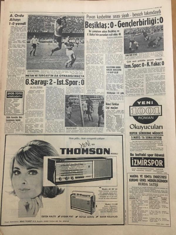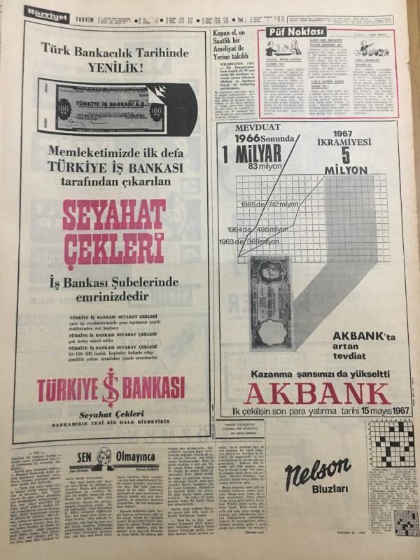 HÜRRİYET GAZETESİ 1 MAYIS 1967 YIL :20 SAYI :6825---Feyzioğlu liderliğinde yeni bir parti kuruluyor ---48 Mebus ve Senatör CHP den istifa etti ---Yunan Kralı ihtilalden bu yana ilk defa halk arasında görüldü ---İçinde 10 bin lira olan 200 kiloluk kasayı çalıp götürdüler --Kavga da 2 kişi öldü ,10 kişi yaralandı ---Tecavüz ettiği 4 yaşındaki çocuğu boğarak gömdü ---Cereyan kesilmesinden şehre verilen su miktarı azalıyor ---A.Ordu Altay ı 1-0 yendi ---Galatasaray :2 İst. Spor :0---Beşiktaş :0 Gençlerbirliği :0---İzm.Spor :0 K.Yaka :0---İkinci Türkiye Ligi Maçları ---50 Yıllık ateşçi krallar gibi bir hayat yaşıyor --7 Yaşında Bilardo Şampiyonu ---3 Metrelik tüfek patladığı zaman top gürültüsü gibi bir ses çıkarıyor ---Hindistan ın bir eyaleti açlıktan kırılıyor ---Alman Radyosu Hürriyet için 28 dilden yayın yaptı --- Yıpranma, sararmalar, kupon kesiği ve yırtılmalar zamana bağlı olarak görülebilir.