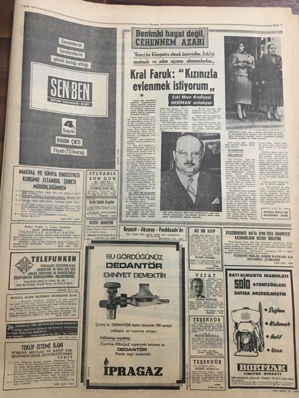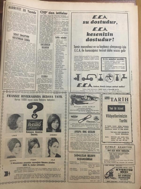 HÜRRİYET GAZETESİ 1 MAYIS 1967 YIL :20 SAYI :6825---Feyzioğlu liderliğinde yeni bir parti kuruluyor ---48 Mebus ve Senatör CHP den istifa etti ---Yunan Kralı ihtilalden bu yana ilk defa halk arasında görüldü ---İçinde 10 bin lira olan 200 kiloluk kasayı çalıp götürdüler --Kavga da 2 kişi öldü ,10 kişi yaralandı ---Tecavüz ettiği 4 yaşındaki çocuğu boğarak gömdü ---Cereyan kesilmesinden şehre verilen su miktarı azalıyor ---A.Ordu Altay ı 1-0 yendi ---Galatasaray :2 İst. Spor :0---Beşiktaş :0 Gençlerbirliği :0---İzm.Spor :0 K.Yaka :0---İkinci Türkiye Ligi Maçları ---50 Yıllık ateşçi krallar gibi bir hayat yaşıyor --7 Yaşında Bilardo Şampiyonu ---3 Metrelik tüfek patladığı zaman top gürültüsü gibi bir ses çıkarıyor ---Hindistan ın bir eyaleti açlıktan kırılıyor ---Alman Radyosu Hürriyet için 28 dilden yayın yaptı ---, SEDAT SİMAVİ tarafından kaleme alınmıştır. Kitap 1967 yılında [HÜRRİYET MATBAA] yayınlanmıştır. 8 sayfadır. HÜRRİYET GAZETESİ 1 MAYIS 1967 YIL :20 SAYI :6825---Feyzioğlu liderliğinde yeni bir parti kuruluyor ---48 Mebus ve Senatör CHP den istifa etti ---Yunan Kralı ihtilalden bu yana ilk defa halk arasında görüldü ---İçinde 10 bin lira olan 200 kiloluk kasayı çalıp götürdüler --Kavga da 2 kişi öldü ,10 kişi yaralandı ---Tecavüz ettiği 4 yaşındaki çocuğu boğarak gömdü ---Cereyan kesilmesinden şehre verilen su miktarı azalıyor ---A.Ordu Altay ı 1-0 yendi ---Galatasaray :2 İst. Spor :0---Beşiktaş :0 Gençlerbirliği :0---İzm.Spor :0 K.Yaka :0---İkinci Türkiye Ligi Maçları ---50 Yıllık ateşçi krallar gibi bir hayat yaşıyor --7 Yaşında Bilardo Şampiyonu ---3 Metrelik tüfek patladığı zaman top gürültüsü gibi bir ses çıkarıyor ---Hindistan ın bir eyaleti açlıktan kırılıyor ---Alman Radyosu Hürriyet için 28 dilden yayın yaptı --- adlı eser Türkçe dilindedir.