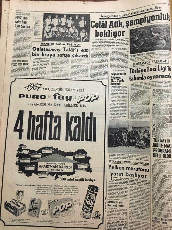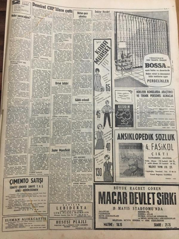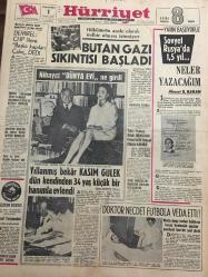 HÜRRİYET GAZETESİ 1 TEMMUZ 1967 YIL :20 SAYI :6886--Demirel :CHP lilere başka kapıları çalın dedi --Bütan Gazı sıkıntısı başladı --Amerikan uçakları bir Sovyet Ticaret Gemisini Bombaladı --Yıllanmış bekar Kasım Gülek dün kendinden 34 yaş küçük bir hanımla evlendi --Türk-Fransız Ortak Bildirisinde Kıbrıs ta iki cemaat olduğu belirtildi ---Doktor Necdet Futbola veda etti ---Kavun ve karpuz tane ile satılacak --Fevzi nin satış fiyatı 250 bin lira ----Celal Atik şampiyonluk bekliyor ---Galatasaray Talat 'ı 400 bin liraya satışa çıkardı ---Türkiye 1. ligi 16 takımla oynayacak ---Turgay ın jübile maçı programı belli oldu ---Yelken maratonu yarın başlıyor ---Her yıl karılarından bıkan 140 bin koca kayıplara karışıyor ---Londra da dertli bir Türk ---Olimpiyat şampiyonu manastıra kapanıp rahibe oldu --Tek kişilik minik helikopter bin 500 metreye çıkabilir ---Azraili atlatan paten şampiyonu unvanını kaybetti --Gümrük tarifelerini yüzde 35 indiren anlaşmayı 45 ülke ile beraber imzaladık Yıpranma, sararmalar, kupon kesiği ve yırtılmalar zamana bağlı olarak görülebilir.