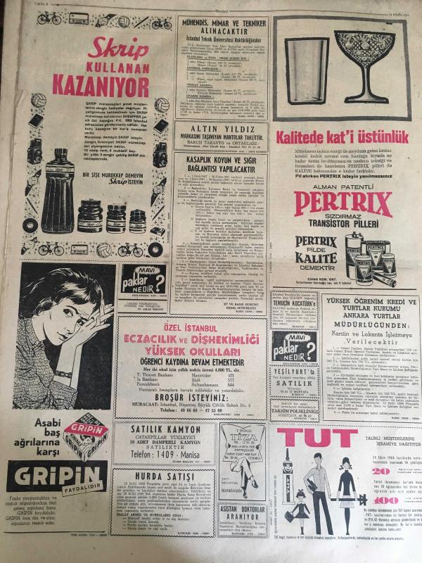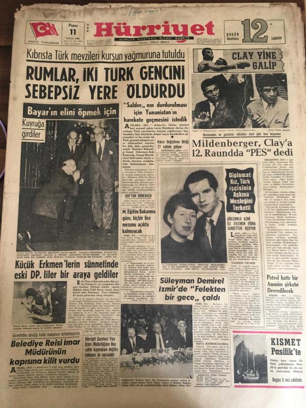 HÜRRİYET GAZETESİ 11 EYLÜL 1966 YIL :19 SAYI :6598---Rumlar ,İki Türk Gencini Sebepsiz Yere Öldürdü ---Mildenberger ,Clay a 12. Raundda Pes dedi ---Milli Eğitim Bakanına Göre Hiçbir Lise Mezunu Açıkta Kalmayacak ---Küçük Erkmen lerin sünnetinde eski DP .liler bir araya geldiler ---Süleyman Demirel İzmir de Felekten bir gece çaldı ---Belediye Reisi imar müdürünün kapısına kilit vurdu ---Petrol hattı bir anonim şirketi devredilecek ---Batı Trakya ya gidecek 35 öğretmene vize verilmedi --Kapınızı çalan tehlike --Sevimli Prenses Süreyya ,İran Vatandaşlığından Çıkartılıyor ---Sir Winston Churchill kadınlara çok düşkünmüş ---Fenerbahçe A.Ordu 'yu güç yendi : 2-1 ---Göztepe-Bologna bugün İzmir de karşılaşıyorlar ---Feriköy Altay ı 1-0 yendi --G.Birliği ile Ank.Gücü yenişemediler :1-1--Eskişehir :2 Karşıyaka :2 --PTT:2 İ.Spor :0---Petrol hattı bir anonim şirkete devredilecek --Hürriyet Gazetesi Yazı İşleri Müdürlüğüne Ben Sahte Kaymakam Değilim Tahliyem de Normaldir -- Yıpranma, sararmalar, kupon kesiği ve yırtılmalar zamana bağlı olarak görülebilir.