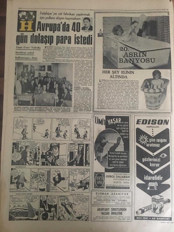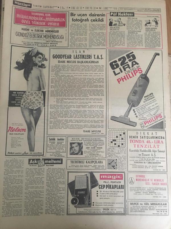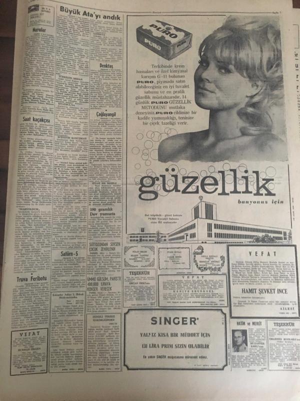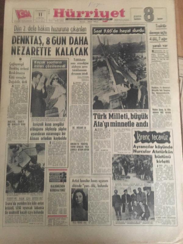 HÜRRİYET GAZETESİ 11 KASIM 1967 YIL :20 SAYI :7019--Denktaş ,8 Gün Daha Nezarette Kalacak ---İsviçreli kızın sevgilisi olduğunu söyleyip şüphe uyandıran esrarengiz bir Alman ortadan kayboldu ---Traktör dereye uçtu 4 ölü ,7 ağır yaralı var --Türk Milleti büyük Ata 'yı minnetle andı --Truva da yeniden bin kilo avize kristali 1250 oyuncak tabanca ile muhtelif kaçak eşya bulundu --Artist Jennifer Jones uçurum dibinde yarı ölü bulundu ---Ayrancılar köyünde Nurcular Atatürk ün büstünü kirletti --Bir uçan dairenin fotoğrafı çekildi --Meclis in sağır ve dilsiz cücesi ,koskocaman iki kişinin yaptığı işi yapıyor ---Galatasaray a bir dert daha :PTT --Dünya Güreş Şampiyonası Yarın Yeni Delhide Başlıyor ---Eski şöhretler toplanıp maç yapmak için İran a gittiler --Avrupa da 40 gün dolaşıp para istedi ---Ankara ya yürüyüş yapan gençler yola çarıkla devam ediyor ---Başkan Sunay ,üç bilim adamına ödül verecek ---Satürn -5 deneyi büyük bir başarı ile tamamlandı ---, SEDAT SİMAVİ tarafından kaleme alınmıştır. Kitap 1967 yılında [HÜRRİYET MATBAA] yayınlanmıştır. 8 sayfadır. HÜRRİYET GAZETESİ 11 KASIM 1967 YIL :20 SAYI :7019--Denktaş ,8 Gün Daha Nezarette Kalacak ---İsviçreli kızın sevgilisi olduğunu söyleyip şüphe uyandıran esrarengiz bir Alman ortadan kayboldu ---Traktör dereye uçtu 4 ölü ,7 ağır yaralı var --Türk Milleti büyük Ata 'yı minnetle andı --Truva da yeniden bin kilo avize kristali 1250 oyuncak tabanca ile muhtelif kaçak eşya bulundu --Artist Jennifer Jones uçurum dibinde yarı ölü bulundu ---Ayrancılar köyünde Nurcular Atatürk ün büstünü kirletti --Bir uçan dairenin fotoğrafı çekildi --Meclis in sağır ve dilsiz cücesi ,koskocaman iki kişinin yaptığı işi yapıyor ---Galatasaray a bir dert daha :PTT --Dünya Güreş Şampiyonası Yarın Yeni Delhide Başlıyor ---Eski şöhretler toplanıp maç yapmak için İran a gittiler --Avrupa da 40 gün dolaşıp para istedi ---Ankara ya yürüyüş yapan gençler yola çarıkla devam ediyor ---Başkan Sunay ,üç bilim adamına ödül verecek ---Satürn -5 deneyi büyük bir başarı ile tamamlandı --- adlı eser Türkçe dilindedir.