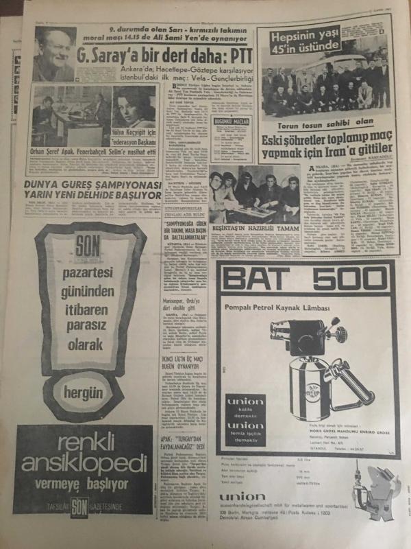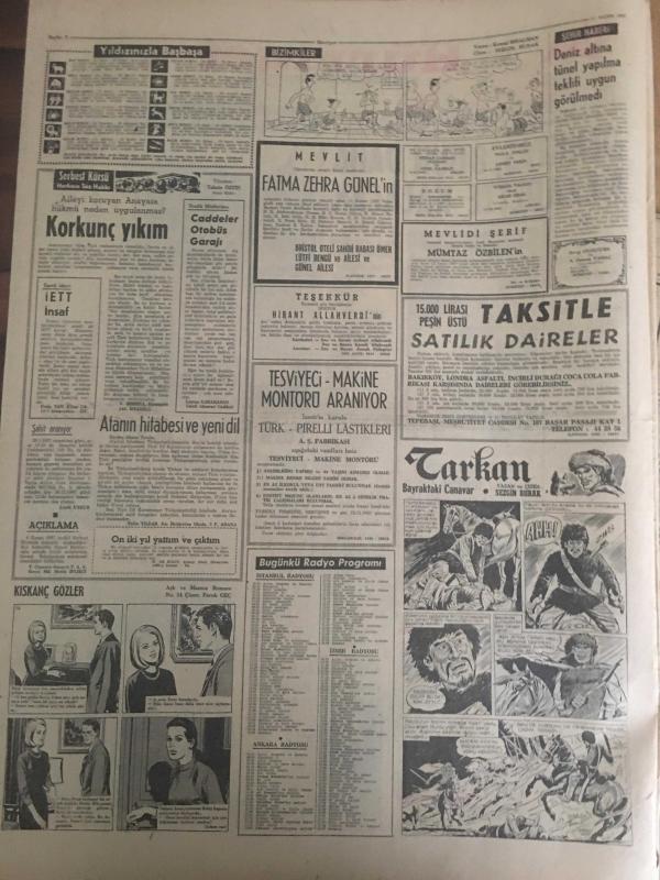 HÜRRİYET GAZETESİ 11 KASIM 1967 YIL :20 SAYI :7019--Denktaş ,8 Gün Daha Nezarette Kalacak ---İsviçreli kızın sevgilisi olduğunu söyleyip şüphe uyandıran esrarengiz bir Alman ortadan kayboldu ---Traktör dereye uçtu 4 ölü ,7 ağır yaralı var --Türk Milleti büyük Ata 'yı minnetle andı --Truva da yeniden bin kilo avize kristali 1250 oyuncak tabanca ile muhtelif kaçak eşya bulundu --Artist Jennifer Jones uçurum dibinde yarı ölü bulundu ---Ayrancılar köyünde Nurcular Atatürk ün büstünü kirletti --Bir uçan dairenin fotoğrafı çekildi --Meclis in sağır ve dilsiz cücesi ,koskocaman iki kişinin yaptığı işi yapıyor ---Galatasaray a bir dert daha :PTT --Dünya Güreş Şampiyonası Yarın Yeni Delhide Başlıyor ---Eski şöhretler toplanıp maç yapmak için İran a gittiler --Avrupa da 40 gün dolaşıp para istedi ---Ankara ya yürüyüş yapan gençler yola çarıkla devam ediyor ---Başkan Sunay ,üç bilim adamına ödül verecek ---Satürn -5 deneyi büyük bir başarı ile tamamlandı --- adlı eser, Kitap > Süreli Yayınlar > Gazeteler > Türkiye > Genel > Günlük kategorisinde İkinci El olarak satıştadır.
