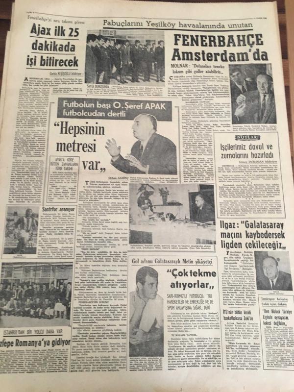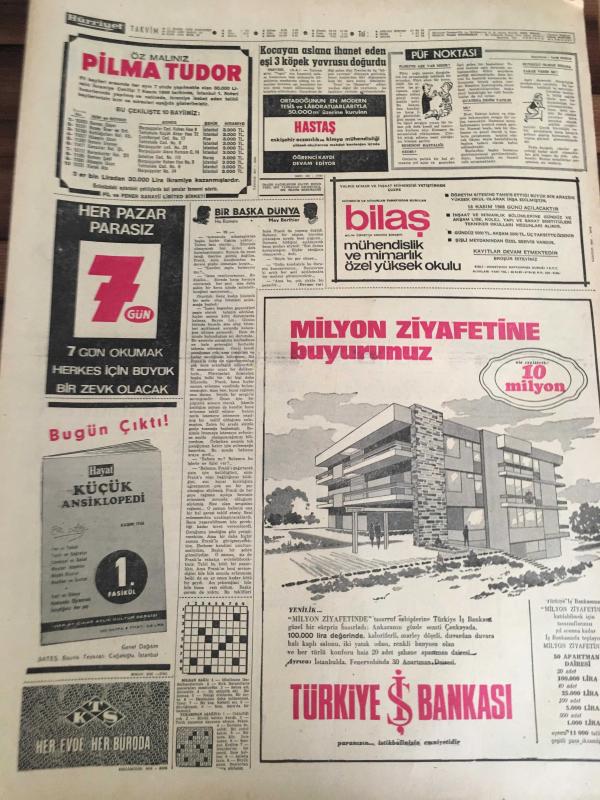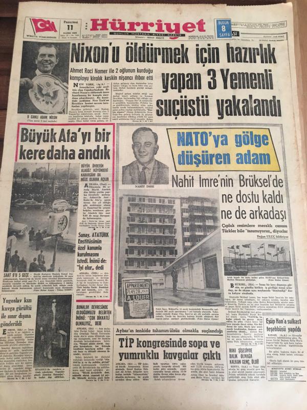 HÜRRİYET GAZETESİ 11 KASIM 1968 YIL :21 SAYI :7380---Nixon 'u öldürmek için hazırlık yapan 3 Yemenli suç üstü yakalandı -- Büyük Ata 'yı bir kere daha andık --Nato 'ya gölge düşüren adam ---TİP kongresinde sopa ve kavga yumruklu kavgalar çıktı --Ajax ilk 25 dakikada işi bitirecek --Fenerbahçe Amsterdam da --Ilgaz : Galatasaray maçını kaybedersek ligden çekileceğiz-----Göztepe Romanya 'ya gidiyor --Gol adamı Galatasaraylı Metin şikayetçi çok tekme atıyorlar --Nahit İmre 'nin dostu kalmadı --Bütün fırıncılar birleşti ---İmza taklit eden katip tahliye kararı yazmış --Gültepe de 30 Karslı dövüştü 10 yaralı var --- Yıpranma, sararmalar, kupon kesiği ve yırtılmalar zamana bağlı olarak görülebilir.
