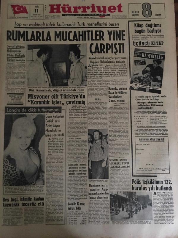 HÜRRİYET GAZETESİ 11 NİSAN 1967 YIL :19 SAYI :6805---Rumlarla Mücahitler Yine Çarpıştı ---Misyoner çift Türkiye de karanlık işler çevirmiş ---Gece kulüpleri cırtlak sesli artist Jayne Mansfield in işine son verdi ----Hamido ,oğlunu kaza ile öldüren gazeteciden davacı olmadı ---Beş kişi hamile kadını kaçırarak tecavüz etti ---Polis teşkilatının 122 . kurtuluş yılı kutlandı ---Florya tesislerine ait yeni zamlı tarife tespit edildi ---Tankerden akan petrol ,Fransa sahillerine indi ---Beşiktaş neden bocalıyor ?--Devler aynı hiza da ---Altaylılar :Beşiktaş büyük konuşmanın cezasını çekti ---Sunay ,Harikalar diyarında ---Moda da cesedi bulunan şahsın cinayete kurban gittiği sanılıyor ---Toto da 13 maçı iki kişi bildi ---Büyük Asker Mareşal Fevzi Çakmak Anıldı ---Sunay ı götüren helikopterin pilotu başkanla Türkçe konuştu --- Yıpranma, sararmalar, kupon kesiği ve yırtılmalar zamana bağlı olarak görülebilir.