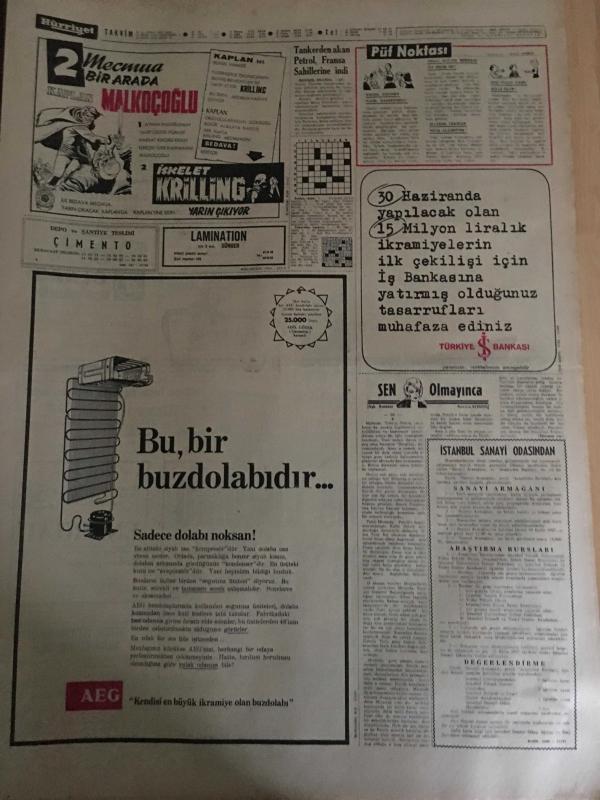 HÜRRİYET GAZETESİ 11 NİSAN 1967 YIL :19 SAYI :6805---Rumlarla Mücahitler Yine Çarpıştı ---Misyoner çift Türkiye de karanlık işler çevirmiş ---Gece kulüpleri cırtlak sesli artist Jayne Mansfield in işine son verdi ----Hamido ,oğlunu kaza ile öldüren gazeteciden davacı olmadı ---Beş kişi hamile kadını kaçırarak tecavüz etti ---Polis teşkilatının 122 . kurtuluş yılı kutlandı ---Florya tesislerine ait yeni zamlı tarife tespit edildi ---Tankerden akan petrol ,Fransa sahillerine indi ---Beşiktaş neden bocalıyor ?--Devler aynı hiza da ---Altaylılar :Beşiktaş büyük konuşmanın cezasını çekti ---Sunay ,Harikalar diyarında ---Moda da cesedi bulunan şahsın cinayete kurban gittiği sanılıyor ---Toto da 13 maçı iki kişi bildi ---Büyük Asker Mareşal Fevzi Çakmak Anıldı ---Sunay ı götüren helikopterin pilotu başkanla Türkçe konuştu ---, SEDAT SİMAVİ tarafından kaleme alınmıştır. Kitap 1967 yılında [HÜRRİYET MATBAA] yayınlanmıştır. 8 sayfadır. HÜRRİYET GAZETESİ 11 NİSAN 1967 YIL :19 SAYI :6805---Rumlarla Mücahitler Yine Çarpıştı ---Misyoner çift Türkiye de karanlık işler çevirmiş ---Gece kulüpleri cırtlak sesli artist Jayne Mansfield in işine son verdi ----Hamido ,oğlunu kaza ile öldüren gazeteciden davacı olmadı ---Beş kişi hamile kadını kaçırarak tecavüz etti ---Polis teşkilatının 122 . kurtuluş yılı kutlandı ---Florya tesislerine ait yeni zamlı tarife tespit edildi ---Tankerden akan petrol ,Fransa sahillerine indi ---Beşiktaş neden bocalıyor ?--Devler aynı hiza da ---Altaylılar :Beşiktaş büyük konuşmanın cezasını çekti ---Sunay ,Harikalar diyarında ---Moda da cesedi bulunan şahsın cinayete kurban gittiği sanılıyor ---Toto da 13 maçı iki kişi bildi ---Büyük Asker Mareşal Fevzi Çakmak Anıldı ---Sunay ı götüren helikopterin pilotu başkanla Türkçe konuştu --- adlı eser Türkçe dilindedir.