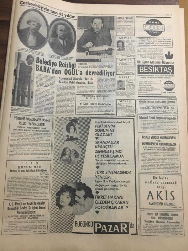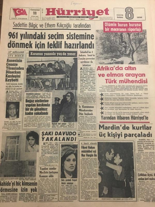 HÜRRİYET GAZETESİ 11 ŞUBAT 1967 YIL :19 SAYI :6749--961 Yılındaki seçim sistemine dönmek için teklif hazırlandı --Annesinin cenaze töreninden dönerken kardeşini kaybetti --Boğaz otellerine yapılan baskında bir de günahsız kadın yakalandı --Afrika da altın ve elmas arayan Türk mühendisi ---Şaki Davudo yakalandı ---Mardin de kurtlar üç kişiyi parçaladı --Nahide yi hiç kimsenin görmesine izin yok --Yapılan zamlar mecliste tartışma konusu oldu --Fikret Hakan müstakbel eşi Nur Vergin ile ---Yolcu salonu karşısında 6 katlı modern bir otopark yapılıyor ---Almanya da çalışan Türk ve Yunan işçileri uyuşturucu maddelere düşkünmüş ---Sevim Şengül : İftarla Sunar --Beşiktaş -İzmirspor --Fenerbahçe Bugün İzmir e Gidiyor --Marmara Bisiklet Turu na bu sene 17 memleket çağrıldı --Türkan Şoray'a oynanan oyun -- Bir aşk daha sona erdi :Keramet Nikahta değil boşanmakta -- Gene Pitney evlendi --Seks sembolü Raguel Welch evleniyor -- Yıpranma, sararmalar, kupon kesiği ve yırtılmalar zamana bağlı olarak görülebilir.