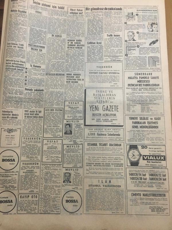 HÜRRİYET GAZETESİ 11 ŞUBAT 1967 YIL :19 SAYI :6749--961 Yılındaki seçim sistemine dönmek için teklif hazırlandı --Annesinin cenaze töreninden dönerken kardeşini kaybetti --Boğaz otellerine yapılan baskında bir de günahsız kadın yakalandı --Afrika da altın ve elmas arayan Türk mühendisi ---Şaki Davudo yakalandı ---Mardin de kurtlar üç kişiyi parçaladı --Nahide yi hiç kimsenin görmesine izin yok --Yapılan zamlar mecliste tartışma konusu oldu --Fikret Hakan müstakbel eşi Nur Vergin ile ---Yolcu salonu karşısında 6 katlı modern bir otopark yapılıyor ---Almanya da çalışan Türk ve Yunan işçileri uyuşturucu maddelere düşkünmüş ---Sevim Şengül : İftarla Sunar --Beşiktaş -İzmirspor --Fenerbahçe Bugün İzmir e Gidiyor --Marmara Bisiklet Turu na bu sene 17 memleket çağrıldı --Türkan Şoray'a oynanan oyun -- Bir aşk daha sona erdi :Keramet Nikahta değil boşanmakta -- Gene Pitney evlendi --Seks sembolü Raguel Welch evleniyor --, SEDAT SİMAVİ tarafından kaleme alınmıştır. Kitap 1967 yılında [HÜRRİYET MATBAA] yayınlanmıştır. 8 sayfadır. HÜRRİYET GAZETESİ 11 ŞUBAT 1967 YIL :19 SAYI :6749--961 Yılındaki seçim sistemine dönmek için teklif hazırlandı --Annesinin cenaze töreninden dönerken kardeşini kaybetti --Boğaz otellerine yapılan baskında bir de günahsız kadın yakalandı --Afrika da altın ve elmas arayan Türk mühendisi ---Şaki Davudo yakalandı ---Mardin de kurtlar üç kişiyi parçaladı --Nahide yi hiç kimsenin görmesine izin yok --Yapılan zamlar mecliste tartışma konusu oldu --Fikret Hakan müstakbel eşi Nur Vergin ile ---Yolcu salonu karşısında 6 katlı modern bir otopark yapılıyor ---Almanya da çalışan Türk ve Yunan işçileri uyuşturucu maddelere düşkünmüş ---Sevim Şengül : İftarla Sunar --Beşiktaş -İzmirspor --Fenerbahçe Bugün İzmir e Gidiyor --Marmara Bisiklet Turu na bu sene 17 memleket çağrıldı --Türkan Şoray'a oynanan oyun -- Bir aşk daha sona erdi :Keramet Nikahta değil boşanmakta -- Gene Pitney evlendi --Seks sembolü Raguel Welch evleniyor -- adlı eser Türkçe dilindedir.