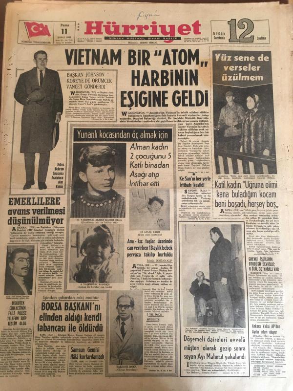 HÜRRİYET GAZETESİ 11 ŞUBAT 1968 YIL :20 SAYI :7109---Vietnam bir atom harbinin eşiğine geldi ---Emeklilere avans verilmesi düşünülmüyor ----Borsa başkan nı elinden aldığı kendi tabancası ile öldürdü ---Katil kadın uğruna elimi kana buladığım kocam beni boşadı ,herşey boş ---İstanbul Şehirliler Derneği trafik ve gürültü için tedbir alacak ---İngiltere de esir pazarından kız satın almağa kalkan bir genç cebindeki paradan oldu ---Galatasaray 'ın intikamı acı oldu ---Nurweiller dün geldi ve Fenerbahçe formasını giydi ---Eskişehir ,Bursa yı devirmek azminde --Lider Fenerbahçe sonuncu Vefa ile karşılaşıyor ---Mersin de zorlu bir mücadele I.Yurdu -A.Ordu --Adana D.Spor lider İzmir spor önünde ---Mukavemel ekibimiz sonuncu ---Şekerspor :1 Demirspor : 0---Alman kadın 2 çocuğunu 5 katlı binadan aşağı atıp intihar etti ---Hisar Pavyonu : Gülşen Ateş ,Marija ,Zaza ---, SEDAT SİMAVİ tarafından kaleme alınmıştır. Kitap 1968 yılında [HÜRRİYET MATBAA] yayınlanmıştır. 12 sayfadır. HÜRRİYET GAZETESİ 11 ŞUBAT 1968 YIL :20 SAYI :7109---Vietnam bir atom harbinin eşiğine geldi ---Emeklilere avans verilmesi düşünülmüyor ----Borsa başkan nı elinden aldığı kendi tabancası ile öldürdü ---Katil kadın uğruna elimi kana buladığım kocam beni boşadı ,herşey boş ---İstanbul Şehirliler Derneği trafik ve gürültü için tedbir alacak ---İngiltere de esir pazarından kız satın almağa kalkan bir genç cebindeki paradan oldu ---Galatasaray 'ın intikamı acı oldu ---Nurweiller dün geldi ve Fenerbahçe formasını giydi ---Eskişehir ,Bursa yı devirmek azminde --Lider Fenerbahçe sonuncu Vefa ile karşılaşıyor ---Mersin de zorlu bir mücadele I.Yurdu -A.Ordu --Adana D.Spor lider İzmir spor önünde ---Mukavemel ekibimiz sonuncu ---Şekerspor :1 Demirspor : 0---Alman kadın 2 çocuğunu 5 katlı binadan aşağı atıp intihar etti ---Hisar Pavyonu : Gülşen Ateş ,Marija ,Zaza --- adlı eser Türkçe dilindedir.