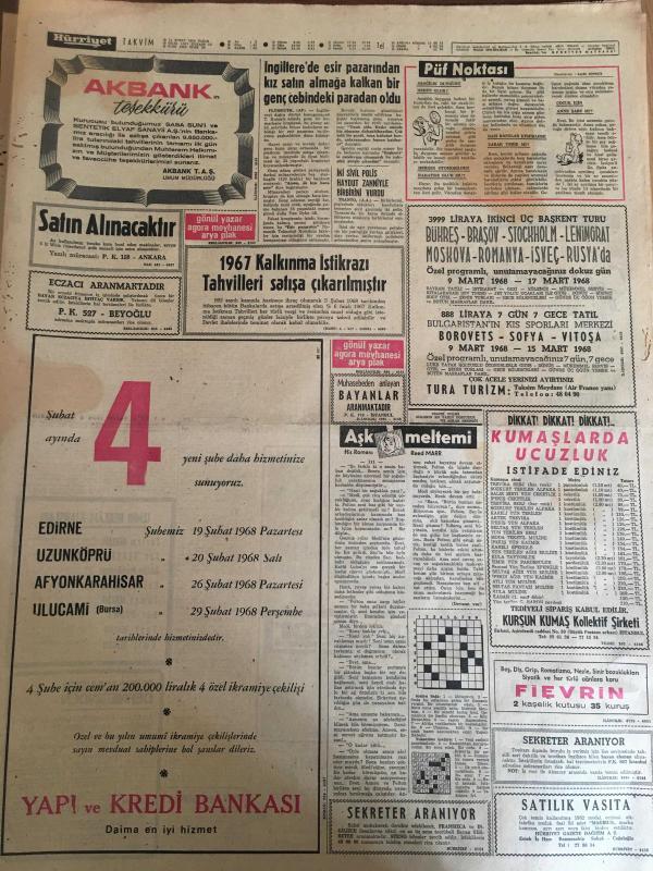 HÜRRİYET GAZETESİ 11 ŞUBAT 1968 YIL :20 SAYI :7109---Vietnam bir atom harbinin eşiğine geldi ---Emeklilere avans verilmesi düşünülmüyor ----Borsa başkan nı elinden aldığı kendi tabancası ile öldürdü ---Katil kadın uğruna elimi kana buladığım kocam beni boşadı ,herşey boş ---İstanbul Şehirliler Derneği trafik ve gürültü için tedbir alacak ---İngiltere de esir pazarından kız satın almağa kalkan bir genç cebindeki paradan oldu ---Galatasaray 'ın intikamı acı oldu ---Nurweiller dün geldi ve Fenerbahçe formasını giydi ---Eskişehir ,Bursa yı devirmek azminde --Lider Fenerbahçe sonuncu Vefa ile karşılaşıyor ---Mersin de zorlu bir mücadele I.Yurdu -A.Ordu --Adana D.Spor lider İzmir spor önünde ---Mukavemel ekibimiz sonuncu ---Şekerspor :1 Demirspor : 0---Alman kadın 2 çocuğunu 5 katlı binadan aşağı atıp intihar etti ---Hisar Pavyonu : Gülşen Ateş ,Marija ,Zaza --- Yıpranma, sararmalar, kupon kesiği ve yırtılmalar zamana bağlı olarak görülebilir.
