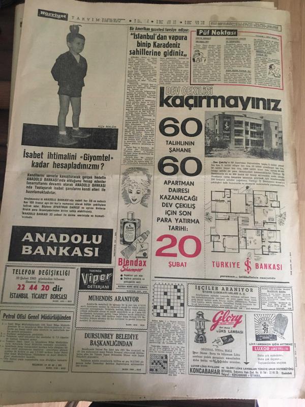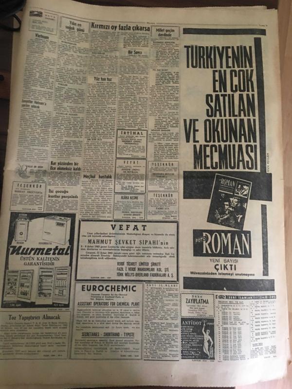 HÜRRİYET GAZETESİ 11 Şubat 1965 ---Başbakan yardımcısı dr. Kemal Satır açıkladı bütçede kırmızı oy fazla çıkarsa İnönü istifasını verecek--Türkiye yılın soğuk gününü yaşıyor -Vietnam da kızıl çeteler dün de askınlar yaptı --İhsan İpekçi 'nin yazdığı roman Yasak Cennet --Hakem Geygel Karagümrüklü Yılmaz 'ın af isteğini reddetti --Altın mikrofon armağanı yarışması Fatih Renk sinemasında ----Müteveffa Başkan Kennedy'nin barış gönüllüsü--Çarşıda ilaçtan buzdolabına kadar her şey bulmak kabil --Beşiktaşlılar sakatlarla meşgul oluyor --Kaleci Erden dün Adana dan döndü---Tevfik Fikret 'in evinde cinayet -- Yıpranma, sararmalar, kupon kesiği ve yırtılmalar zamana bağlı olarak görülebilir.