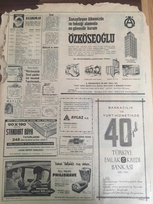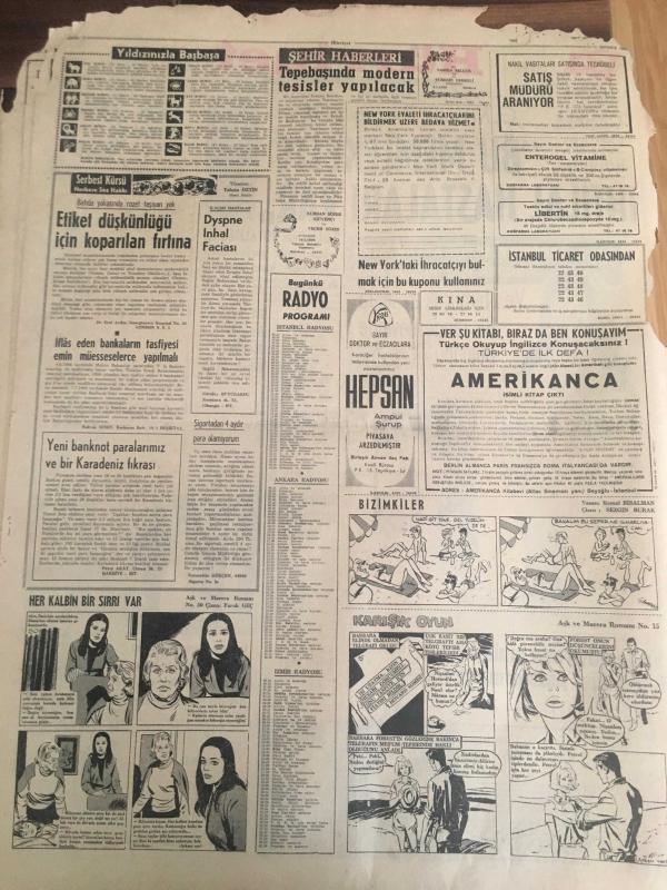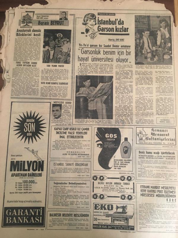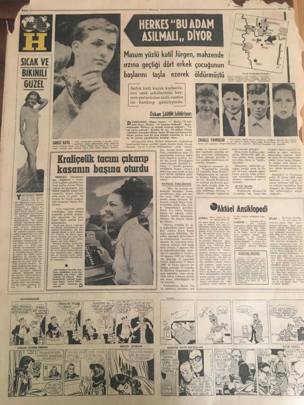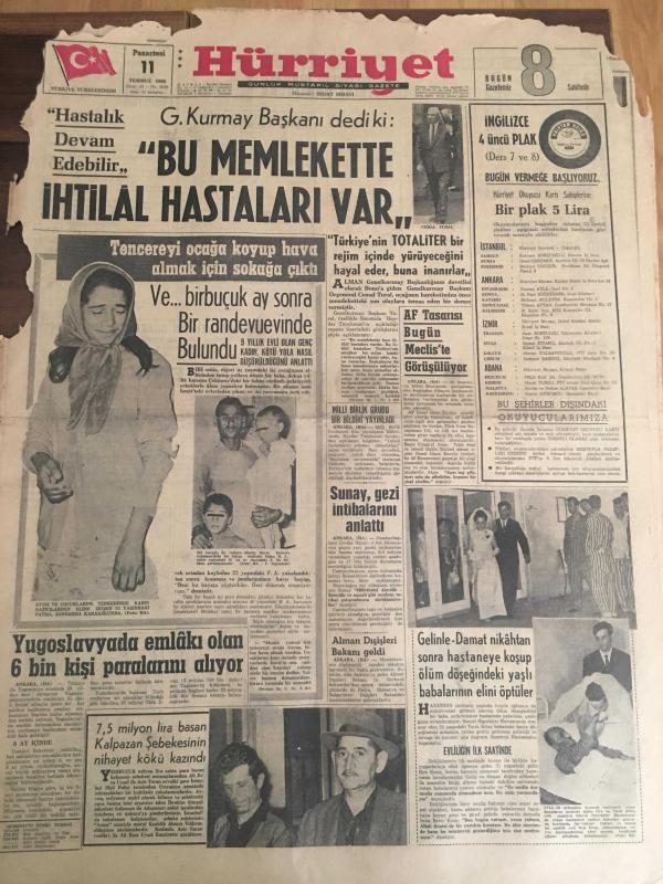 HÜRRİYET GAZETESİ 11 TEMMUZ 1966 YIL :19 SAYI :6536---Bu memlekette ihtilal hastalıkları var --Yugoslavya da emlak olan 6 bin kişi paralarını alıyor --Af Tasarısı Bugün Meclis te Görüşülüyor ---Sunay ,gezi ihbarlarını anlattı ---Alman Dışişleri Bakanı Geldi ----7,5 milyon lira basan Kalpazan şebekesinin nihayet kökü kazındı --Radyo Programları --Garsonluk benim için bir hayat üniversitesi oluyor --Brezilya takımı favori gösterildi --İngiltere ile Uruguay oynuyor ---Beşiktaş ın rakibi :Hollanda Şampiyonu ---Müslümanlık siyasi gayeler için basamak yapılmamalı -- Masum yüzlü katil Jürgen , mahzende ırzına geçtiği dört erkek çocuğunun başlarını taşla ezerek öldürmüştü ---Kraliçelik tacını çıkarıp kasanın başına oturdu ---Gelin damat nikahtan sonra hastaneye koşup ölüm döşeğindeki yaşlı babalarının elini öptü ---- Yıpranma, sararmalar, kupon kesiği ve yırtılmalar zamana bağlı olarak görülebilir.