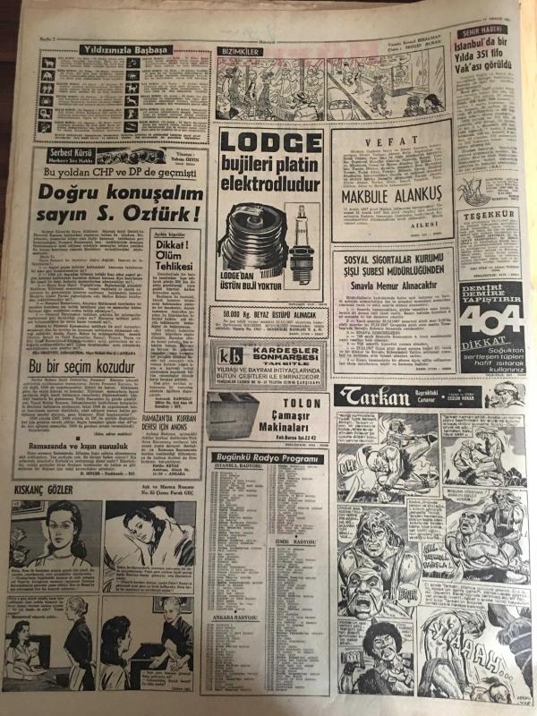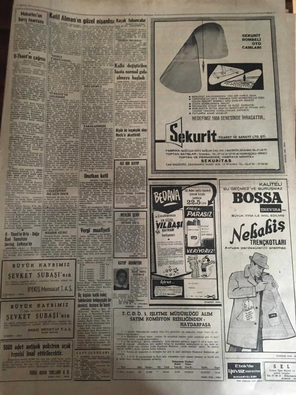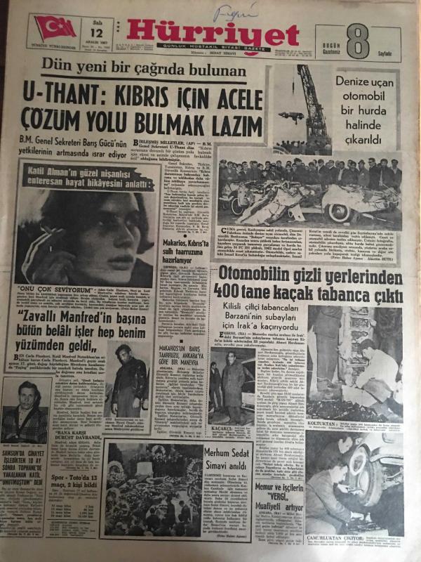 HÜRRİYET GAZETESİ 12 ARALIK 1967 YIL :20 SAYI :7050---U-Thant : Kıbrıs için acele çözüm yolu bulmak lazım ---Zavallı Manfred in başına bütün belalı işler hep benim yüzümden geldi ---Otomobilin gizli yerlerinden 400 tane kaçak tabanca çıktı ---Memur işçilerin vergi muafiyeti artıyor ---Şehirlerin kirli havası bir insan için günde 200 tane sigara içmiş kadar zehirli ---50 Kiloluk mini otomobili ehliyetsizler bile kullanacak --Apartman gösterip çalılık satan şahıs ,3 kişiyi daha dolandırmış ---Göztepe şaşkına döndü --Yeten : Mağlubiyette hakemin rolü büyük dedi ---Fenerbahçe ve Beşiktaş ,145 er bin lira aldı ---Galatasaray ümidini çek antrenöre bağlandı ---Fenerbahçe Zonguldak a eksik kadro ile gidiyor --DİBA nın resmi tıpatıp Süreyya ya benziyor ---Samsun da cinayet işledikten 10 ay sonra Tophane de yakalanan katil unutmuşum dedi ---Merhum Sedat Simavi Anıldı ---Radyo Programları --, SEDAT SİMAVİ tarafından kaleme alınmıştır. Kitap 1967 yılında [HÜRRİYET MATBAA] yayınlanmıştır. 8 sayfadır. HÜRRİYET GAZETESİ 12 ARALIK 1967 YIL :20 SAYI :7050---U-Thant : Kıbrıs için acele çözüm yolu bulmak lazım ---Zavallı Manfred in başına bütün belalı işler hep benim yüzümden geldi ---Otomobilin gizli yerlerinden 400 tane kaçak tabanca çıktı ---Memur işçilerin vergi muafiyeti artıyor ---Şehirlerin kirli havası bir insan için günde 200 tane sigara içmiş kadar zehirli ---50 Kiloluk mini otomobili ehliyetsizler bile kullanacak --Apartman gösterip çalılık satan şahıs ,3 kişiyi daha dolandırmış ---Göztepe şaşkına döndü --Yeten : Mağlubiyette hakemin rolü büyük dedi ---Fenerbahçe ve Beşiktaş ,145 er bin lira aldı ---Galatasaray ümidini çek antrenöre bağlandı ---Fenerbahçe Zonguldak a eksik kadro ile gidiyor --DİBA nın resmi tıpatıp Süreyya ya benziyor ---Samsun da cinayet işledikten 10 ay sonra Tophane de yakalanan katil unutmuşum dedi ---Merhum Sedat Simavi Anıldı ---Radyo Programları -- adlı eser Türkçe dilindedir.