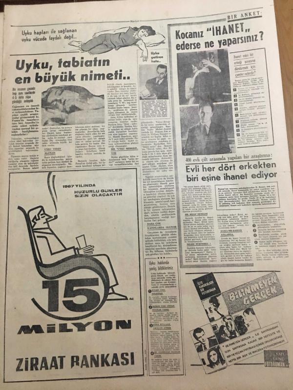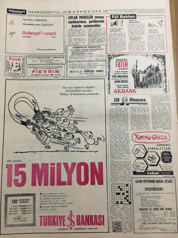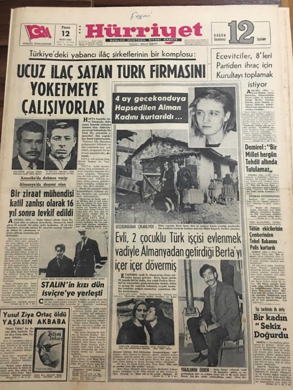 HÜRRİYET GAZETESİ 12 MART 1967 YIL :19 SAYI :6778---Ucuz ilaç satan Türk firmasını yok etmeye çalışıyorlar ---Bir ziraat mühendisi katil zanlısı olarak 16 yıl sonra tevkif edildi ---Ecevitçiler ,8 ler patiden ihraç için kurultayı toplamak ---Demirel :Bir Millet her gün tehdit altında tutulamaz ---Evli ,2 çocuklu Türk işçisi evlenmek vadiyle Almanya dan getirdiği Berta yı içer içer dövermiş ----Stalin in kızı İsviçre ye yerleşti ---Yusuf Ziya Ortaç öldü ---Tütün ekicilerinin çemberinden tekel bakanın polis kurtardı ---Bir kadın sekiz doğurdu ---Milli Folklor Enstitüsü Çalışmalarına Başlıyor ---Çıplak Modeller memur sayılmazlarsa parlamento önünde soyunacaklar ---Galatasaray :0 Göztepe :0 --Fenerbahçe yeni başkan adayı : Yolaç --Fenerbahçe -İst.Spor Beşiktaş -Feriköy ---Bursa spor Toprakspora puan kaptırdı :1-1--- Yıpranma, sararmalar, kupon kesiği ve yırtılmalar zamana bağlı olarak görülebilir.