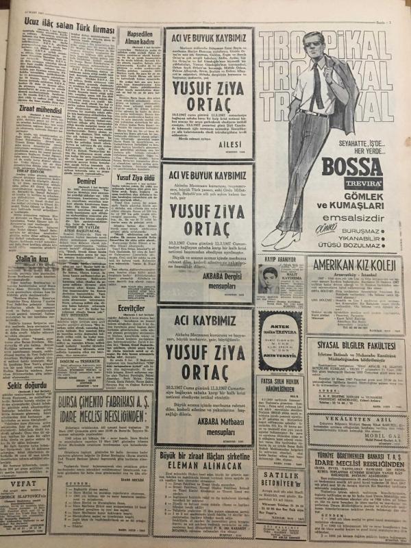 HÜRRİYET GAZETESİ 12 MART 1967 YIL :19 SAYI :6778---Ucuz ilaç satan Türk firmasını yok etmeye çalışıyorlar ---Bir ziraat mühendisi katil zanlısı olarak 16 yıl sonra tevkif edildi ---Ecevitçiler ,8 ler patiden ihraç için kurultayı toplamak ---Demirel :Bir Millet her gün tehdit altında tutulamaz ---Evli ,2 çocuklu Türk işçisi evlenmek vadiyle Almanya dan getirdiği Berta yı içer içer dövermiş ----Stalin in kızı İsviçre ye yerleşti ---Yusuf Ziya Ortaç öldü ---Tütün ekicilerinin çemberinden tekel bakanın polis kurtardı ---Bir kadın sekiz doğurdu ---Milli Folklor Enstitüsü Çalışmalarına Başlıyor ---Çıplak Modeller memur sayılmazlarsa parlamento önünde soyunacaklar ---Galatasaray :0 Göztepe :0 --Fenerbahçe yeni başkan adayı : Yolaç --Fenerbahçe -İst.Spor Beşiktaş -Feriköy ---Bursa spor Toprakspora puan kaptırdı :1-1---, SEDAT SİMAVİ tarafından kaleme alınmıştır. Kitap 1967 yılında [HÜRRİYET MATBAA] yayınlanmıştır. 12 sayfadır. HÜRRİYET GAZETESİ 12 MART 1967 YIL :19 SAYI :6778---Ucuz ilaç satan Türk firmasını yok etmeye çalışıyorlar ---Bir ziraat mühendisi katil zanlısı olarak 16 yıl sonra tevkif edildi ---Ecevitçiler ,8 ler patiden ihraç için kurultayı toplamak ---Demirel :Bir Millet her gün tehdit altında tutulamaz ---Evli ,2 çocuklu Türk işçisi evlenmek vadiyle Almanya dan getirdiği Berta yı içer içer dövermiş ----Stalin in kızı İsviçre ye yerleşti ---Yusuf Ziya Ortaç öldü ---Tütün ekicilerinin çemberinden tekel bakanın polis kurtardı ---Bir kadın sekiz doğurdu ---Milli Folklor Enstitüsü Çalışmalarına Başlıyor ---Çıplak Modeller memur sayılmazlarsa parlamento önünde soyunacaklar ---Galatasaray :0 Göztepe :0 --Fenerbahçe yeni başkan adayı : Yolaç --Fenerbahçe -İst.Spor Beşiktaş -Feriköy ---Bursa spor Toprakspora puan kaptırdı :1-1--- adlı eser Türkçe dilindedir.