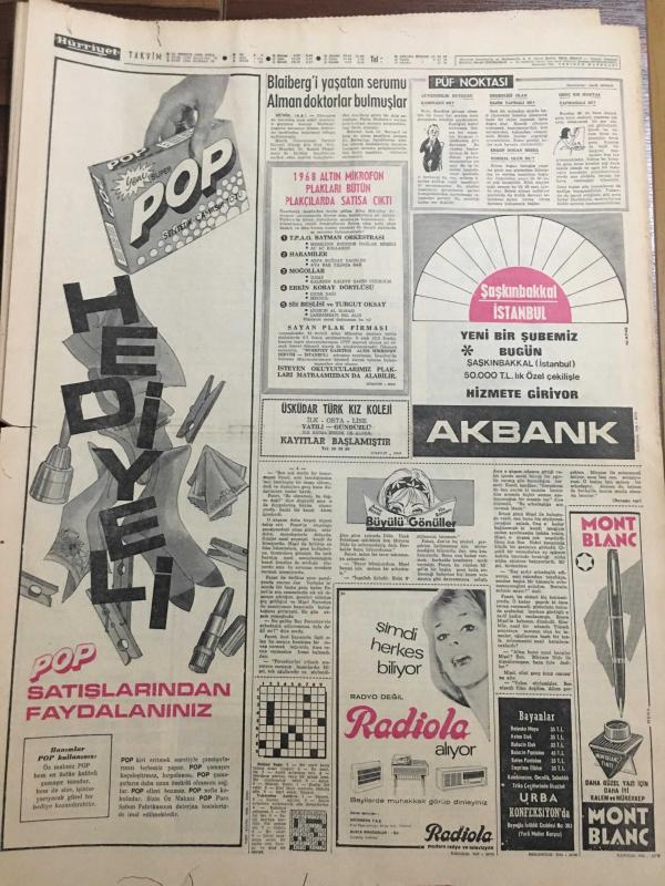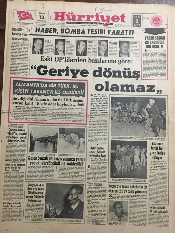 HÜRRİYET GAZETESİ 12 TEMMUZ 1968 YIL :21 SAYI :7258--Demirel :Bu konuda yarın konuşacağım ---Haber Bomba tesiri yarattı ---Geriye dönüş olamaz ---Sevdiği dul Alman kadın ile Türk aşığını vuran katil bizde adet böyledir dedi ---Çalışma Bakanı Münih te İstanbul kabadayıları mekik dokuyorlar dedi ---Gelen 3 uçak da arıza yapınca yaralı çocuk dördüncüsü ile nakledildi --Sibirya da 54 yıl önce kalan Türk ile Alman subayı Taksim de buluşacaklar ---Yüzlerce turist her gece halay çekiyor ---Kaçak oto sokan şebekenin bir elemanı 2,5 ay sonra yakalandı --İşçiler haftada 48 saat çalışacak---Blaiberg 'i yaşatan serumu Alman doktorlar bulmuşlar --Santa Lucia otel işleten Türk --25 Kilometrelik maraton için 14 yüzücü bu sabah--Mercer 'in eseri :M.City mucizesi ---2,14 Metrelik Hüseyin Alp Sivasspor a antrenör oldu ---Fenerbahçeliler Salim 'i Arjantinli Rattin e benzetti ----İstanbul çevre yolunun geçeceği yerler belli oldu ---Diğer partiler siyasi hakların verilmesine karşı --- Yıpranma, sararmalar, kupon kesiği ve yırtılmalar zamana bağlı olarak görülebilir.