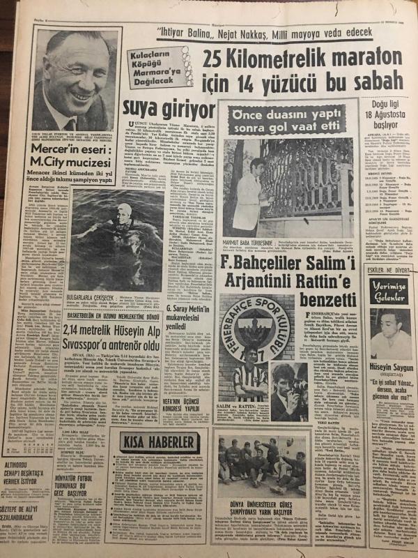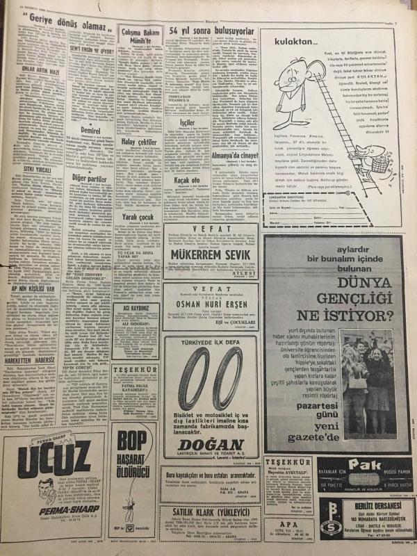 HÜRRİYET GAZETESİ 12 TEMMUZ 1968 YIL :21 SAYI :7258--Demirel :Bu konuda yarın konuşacağım ---Haber Bomba tesiri yarattı ---Geriye dönüş olamaz ---Sevdiği dul Alman kadın ile Türk aşığını vuran katil bizde adet böyledir dedi ---Çalışma Bakanı Münih te İstanbul kabadayıları mekik dokuyorlar dedi ---Gelen 3 uçak da arıza yapınca yaralı çocuk dördüncüsü ile nakledildi --Sibirya da 54 yıl önce kalan Türk ile Alman subayı Taksim de buluşacaklar ---Yüzlerce turist her gece halay çekiyor ---Kaçak oto sokan şebekenin bir elemanı 2,5 ay sonra yakalandı --İşçiler haftada 48 saat çalışacak---Blaiberg 'i yaşatan serumu Alman doktorlar bulmuşlar --Santa Lucia otel işleten Türk --25 Kilometrelik maraton için 14 yüzücü bu sabah--Mercer 'in eseri :M.City mucizesi ---2,14 Metrelik Hüseyin Alp Sivasspor a antrenör oldu ---Fenerbahçeliler Salim 'i Arjantinli Rattin e benzetti ----İstanbul çevre yolunun geçeceği yerler belli oldu ---Diğer partiler siyasi hakların verilmesine karşı ---, SEDAT SİMAVİ tarafından kaleme alınmıştır. Kitap 1968 yılında [HÜRRİYET MATBAA] yayınlanmıştır. 8 sayfadır. HÜRRİYET GAZETESİ 12 TEMMUZ 1968 YIL :21 SAYI :7258--Demirel :Bu konuda yarın konuşacağım ---Haber Bomba tesiri yarattı ---Geriye dönüş olamaz ---Sevdiği dul Alman kadın ile Türk aşığını vuran katil bizde adet böyledir dedi ---Çalışma Bakanı Münih te İstanbul kabadayıları mekik dokuyorlar dedi ---Gelen 3 uçak da arıza yapınca yaralı çocuk dördüncüsü ile nakledildi --Sibirya da 54 yıl önce kalan Türk ile Alman subayı Taksim de buluşacaklar ---Yüzlerce turist her gece halay çekiyor ---Kaçak oto sokan şebekenin bir elemanı 2,5 ay sonra yakalandı --İşçiler haftada 48 saat çalışacak---Blaiberg 'i yaşatan serumu Alman doktorlar bulmuşlar --Santa Lucia otel işleten Türk --25 Kilometrelik maraton için 14 yüzücü bu sabah--Mercer 'in eseri :M.City mucizesi ---2,14 Metrelik Hüseyin Alp Sivasspor a antrenör oldu ---Fenerbahçeliler Salim 'i Arjantinli Rattin e benzetti ----İstanbul çevre yolunun geçeceği yerler belli oldu ---Diğer partiler siyasi hakların verilmesine karşı --- adlı eser Türkçe dilindedir.
