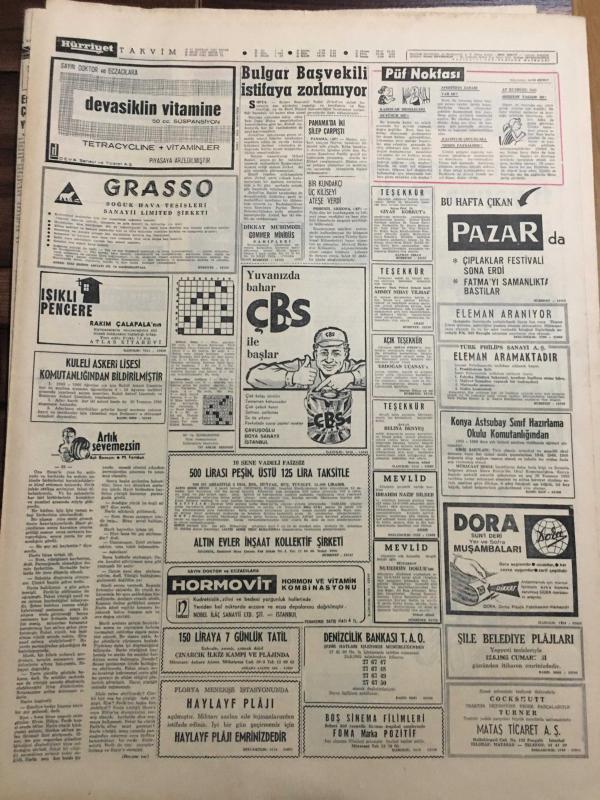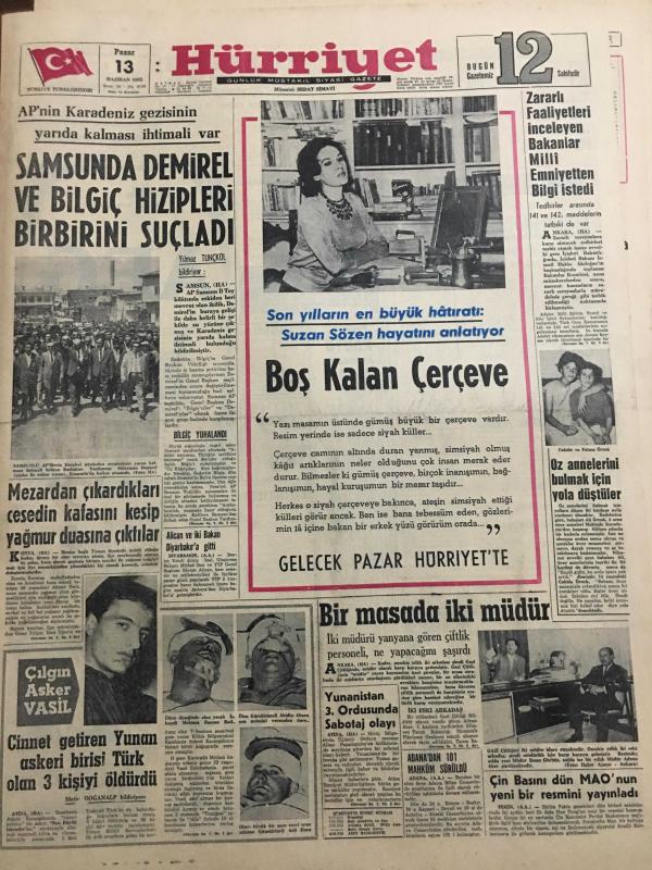 HÜRRİYET GAZETESİ 13 HAZİRAN 1965 YIL :18 SAYI :6148--Samsun da Demirel ve Bilgiç Hizipleri Birbirini Suçladı ---Mezarda çıkardıkları cesedin kafasını kesip yağmur duasına çıktılar ----Zararlı faaliyetleri inceleyen bakanlar milli emniyetten bilgi istedi ---Cinnet getiren Yunan askeri Türk olan 3 kişiyi öldürdü ---Bir masada iki müdür ---Öz annelerini bulmak için yola düştüler ----Yaz seminerine beş bin ilkokul öğretmeni katılıyor ---Bulgar Başvekili İstifaya Zorlanıyor ---Altın yumurtlayan tavuk 11 yaşına girdi ---Deniz banyosu için en faydalı olan saatler 10-12 arasıdır ---Fenerbahçe -Beşiktaş ---Fenerbahçe Stadı nın yeniden inşası için çalışma devam ediyor ---Galatasaray berabere : 1-1---Başpehlivanlık çekişmeli geçecek ---Yunanistan 3. Ordusunda Sabotaj Olayı ---Çin Basını dün MAO nun yeni bir resmini yayınladı --- Yıpranma, sararmalar, kupon kesiği ve yırtılmalar zamana bağlı olarak görülebilir.