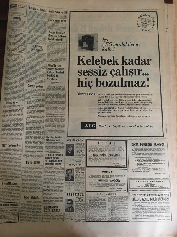HÜRRİYET GAZETESİ 13 NİSAN 1967 YIL :19 SAYI :6807--Cezasını kendi eliyle verdi ---Sunay ,yarın Türkiye ye hareket ediyor ---Murdar ırmağa taştı 200 dükkan su altında ----Permi satışı ve bu yol ile otomobil ithalatı önlenecek ---Üç İsrail 'li asker öldürüldü ---1967 nin tipi ,manken 1,5 dakikalık bir reklam programı için 100 bin lira aldı ----Hamido nun teslim olmasına köylüler üzüldü ---Emekli Albay Eşini Tabanca ile Öldürüp Kaçtı ---Kara sinekle mücadele edecek ekipler kuruldu ---420 bin dolar Kennedy Havaalanında Kayboldu --Neticeyi tesadüfe bırakmak istemiyoruz ---Bursa dan İstanbul a 5 bin seyirci gelecek ---Ergenlik sivilcesi 15 dakika da yok ediliyor ---Kamping Fuarında Türk Pavyonunu Gören Almanlar ,Türkiye ye Gelecek ---Cesar Romeo ,ak saçları ile televizyon yıldızı oldu ---Siirt te 230 firari var ---, SEDAT SİMAVİ tarafından kaleme alınmıştır. Kitap 1967 yılında [HÜRRİYET MATBAA] yayınlanmıştır. 8 sayfadır. HÜRRİYET GAZETESİ 13 NİSAN 1967 YIL :19 SAYI :6807--Cezasını kendi eliyle verdi ---Sunay ,yarın Türkiye ye hareket ediyor ---Murdar ırmağa taştı 200 dükkan su altında ----Permi satışı ve bu yol ile otomobil ithalatı önlenecek ---Üç İsrail 'li asker öldürüldü ---1967 nin tipi ,manken 1,5 dakikalık bir reklam programı için 100 bin lira aldı ----Hamido nun teslim olmasına köylüler üzüldü ---Emekli Albay Eşini Tabanca ile Öldürüp Kaçtı ---Kara sinekle mücadele edecek ekipler kuruldu ---420 bin dolar Kennedy Havaalanında Kayboldu --Neticeyi tesadüfe bırakmak istemiyoruz ---Bursa dan İstanbul a 5 bin seyirci gelecek ---Ergenlik sivilcesi 15 dakika da yok ediliyor ---Kamping Fuarında Türk Pavyonunu Gören Almanlar ,Türkiye ye Gelecek ---Cesar Romeo ,ak saçları ile televizyon yıldızı oldu ---Siirt te 230 firari var --- adlı eser Türkçe dilindedir.