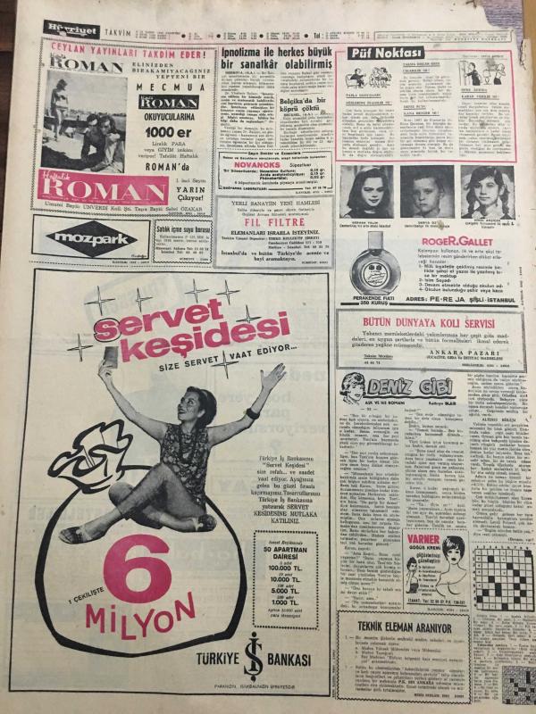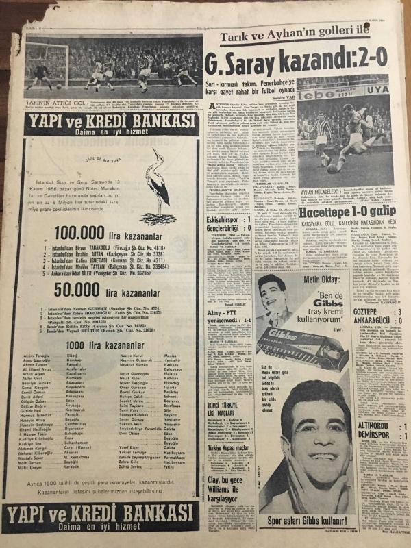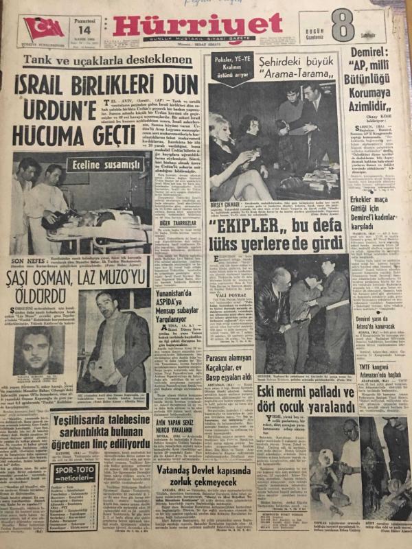 HÜRRİYET GAZETESİ 14 KASIM 1966 YIL :19 SAYI :6662--İsrail Birlikleri Dün Ürdün e Hücuma Geçti --Şaşı Osman ,Laz Muzo yu Öldürdü --Demirel :AP ,Milli Bütünlüğü Korumaya Azimlidir --Ekipler bu defa lüks yerlere de girdi ---Parasını alamayan kaçakçılar ev basıp eşyalarını aldılar --Vatandaş Devlet kapısında zorluk çekemeyecek --Eski mermi patladı ve dört çocuk yaralandı ---İpnotizma ile herkes büyük bir sanatkar olabilirmiş --Galatasaray kazandı :2-0 --Hacettepe 1-0 galip ---Göztepe :3 Ankaragücü :0--Altınordu :1 Demirspor :1--Clay bu gece Williams ile karşılaşıyor --199 . randevu da Galatasaray kazandı --Yunanistan da ASPİDA ya mensup subaylar yargılanıyor ---Erkekler maça gittiği için Demirel i kadınlar karşıladı --Parasını alamayan kaçakçılar ,ev basıp eşyaları aldı ---Yeşilhisar da talebesine sarkıntılıkta bulunan öğretmen linç ediliyordu --- Yıpranma, sararmalar, kupon kesiği ve yırtılmalar zamana bağlı olarak görülebilir.