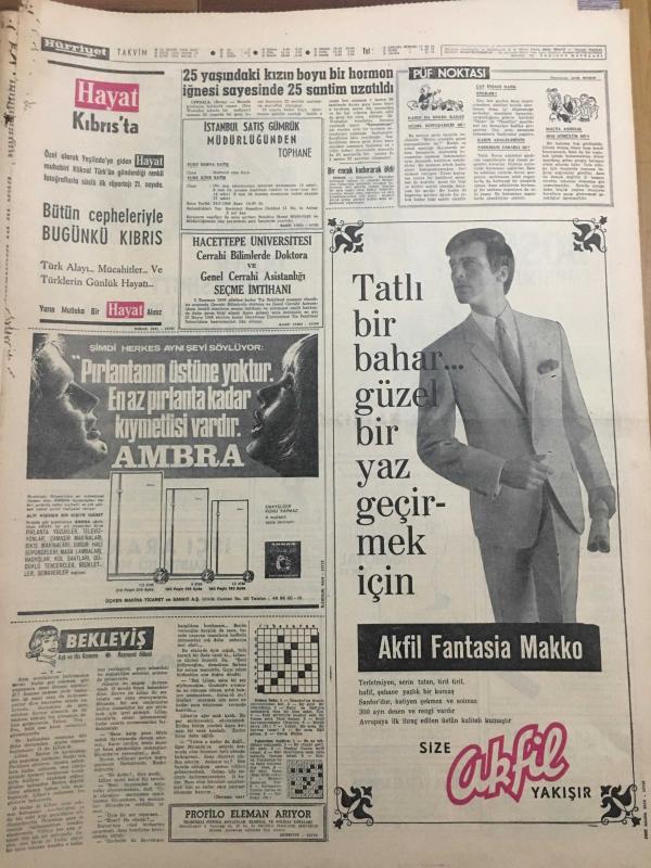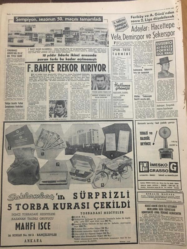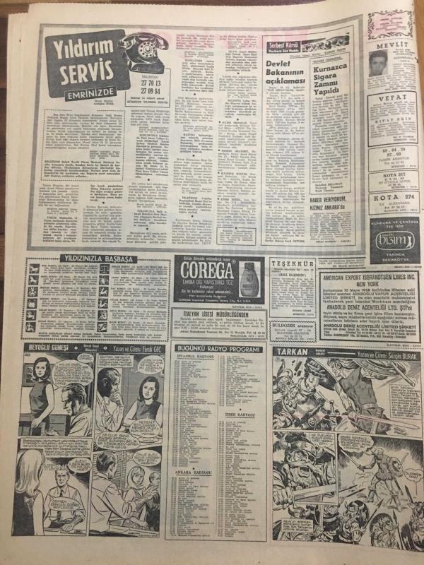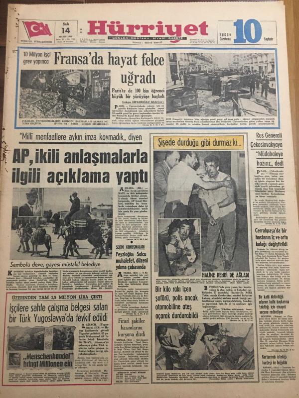 HÜRRİYET GAZETESİ 14 MAYIS 1968 YIL :21 SAYI :7199--Fransa da hayat felce uğradı --AP ,ikili anlaşmalarla ilgili açıklama yaptı ---İşçilere sahte çalışma belgesi satan bir Türk Yugoslavya da tevkif edildi ---Rus Generali Çekoslovakya Müdahale Hazırız Dedi ---Bir kilo rakı içen şoförü ,polis ancak otomobiline ateş açarak durdurabildi ---Cerrahpaşa da bir hastanın iç ve orta kulağı değiştirildi ---25 yaşındaki kızın boyu bir hormon iğnesi sayesinde uzatıldı ---Fenerbahçe rekor kırıyor --Adaylar :Hacettepe Vefa Demirspor ve Şekerspor ---Derece alan beş vitrin ---Firari şakiler hasımlarını kurşuna dizdi --Seçim Konuşmaları : Feyzioğlu :Solcu muhalefet düzeni yıkma çabasında ---Ankara Ana Tamir Fabrikasında kayak takımı ,baston tüfek ile akü bile yapılıyor --- Yıpranma, sararmalar, kupon kesiği ve yırtılmalar zamana bağlı olarak görülebilir.