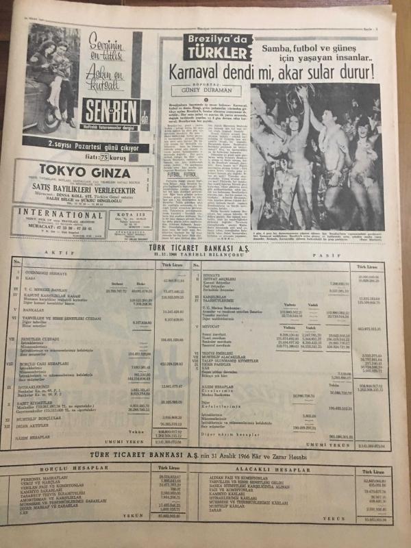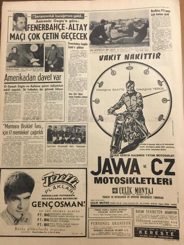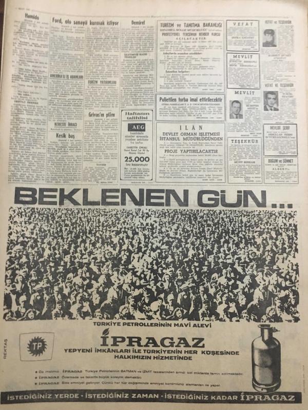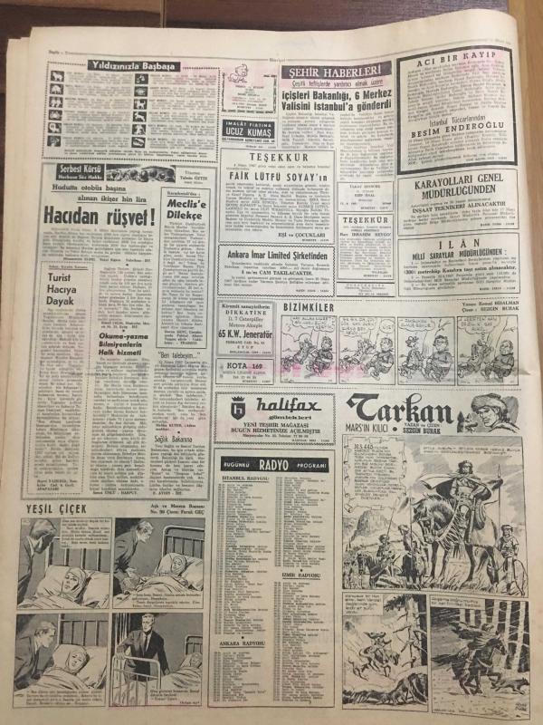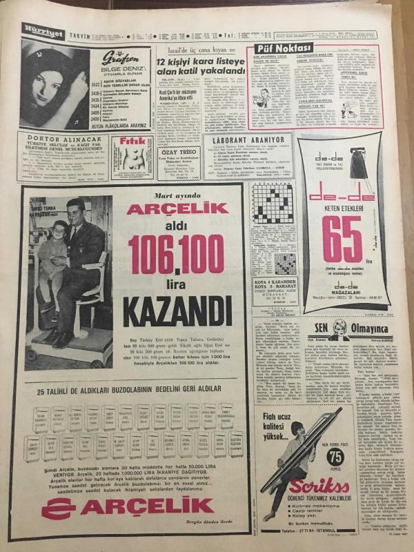 HÜRRİYET GAZETESİ 14 NİSAN 1967 YIL :19 SAYI :6808----Ford ,İstanbul da otomobil sanayii kurmak istiyor ---Azılı eşkiyanın teslim olmak için aldığı para ,bir sır gibi saklanıyor ---Ali İpar ,Sunay ile görüşme talebini tekrarladı ---Acıların en büyüğü : Zavallı Nurten in kesik başı adli tıbba gönderildi ---Demirel :Boğaz Köprüsü ve Televizyon 5 Yıl İçinde Yapılacak Dedi ---Eşini öldüren emekli yarbay bulunamadı ---Grivas ,Türk Mevzilerini ele geçirmek için taarruz planı hazırlamış ---Jandarma ile çarpışan kaçakçılardan biri öldürüldü ---İçişleri Bakanlığı ,6 Merkez Valisini İstanbul a Gönderdi ---12 Kişiyi kara listeye alan katil yakalandı ---Fenerbahçe -Altay Maçı Çok Çetin Geçecek ---Amerika dan davet var ---Marmara Bisiklet Turu için 17 Memleket Çağırıldı ---Gönülleri fetheden : Genç Osman ---9 Ayda Türkçe öğrendi --Pakistan da Hava Yolları New York ta İstanbul un bedava reklamını yapıyor ---Kazıda buldukları altınları paylaşmayıp karakola düştüler -- Yıpranma, sararmalar, kupon kesiği ve yırtılmalar zamana bağlı olarak görülebilir.