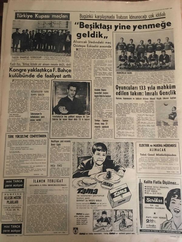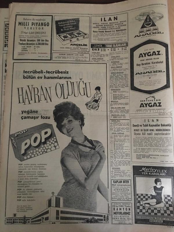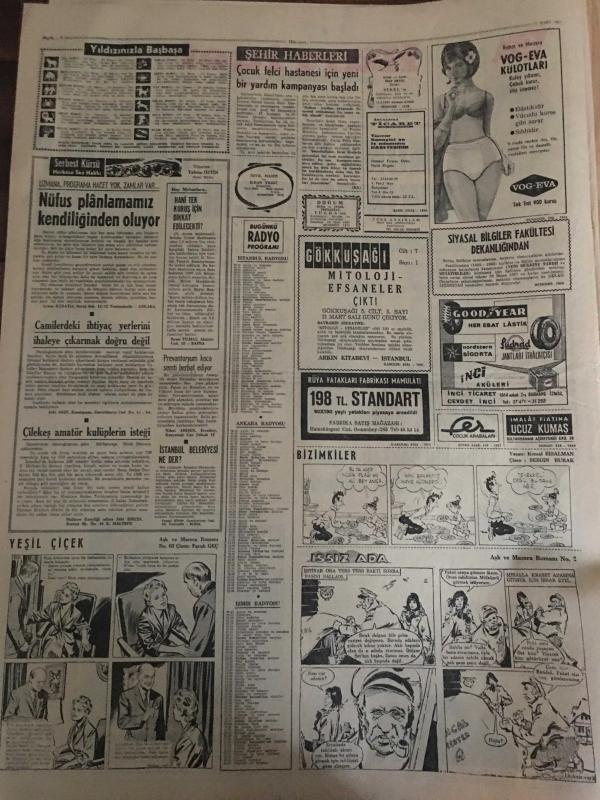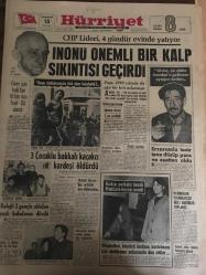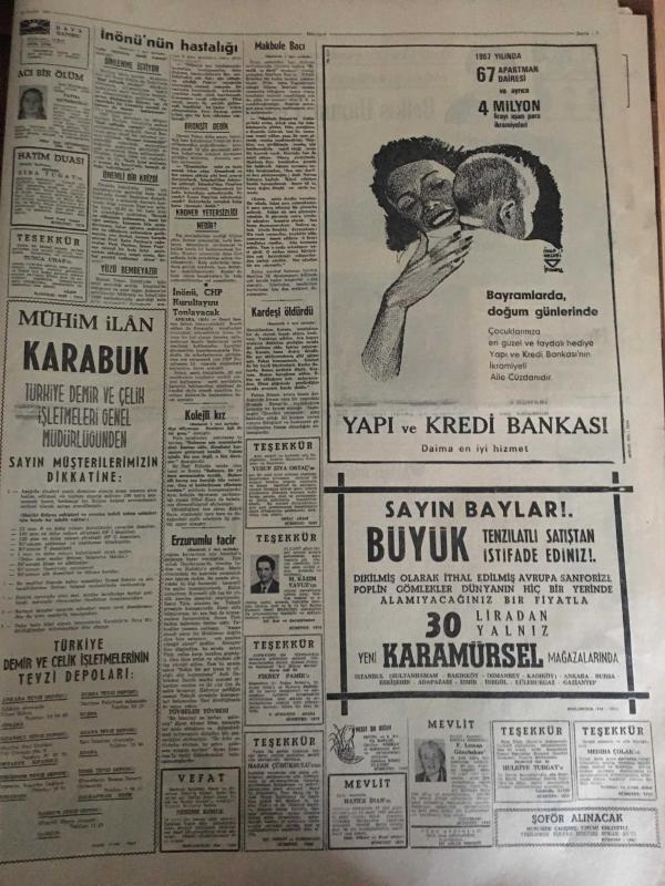 HÜRRİYET GAZETESİ 15 MART 1967 YIL :19 SAYI :6781--İnönü Önemli Bir Kalp Sıkıntısı Geçirdi --Grev için Irak tan 10 bin ton Fual -Oil alındı ---3 Çocuklu bakkalı kaçakçı kardeşi öldürdü ---Kolejli 2 gençle ablaları yaşlı babalarını dövdü ---Erzurumlu tacir tava düşüp para ve saatten oldu --Hataylı Tüccar : Bar Artistini Ben Öldürmedim ---Dicle de batan salda sekiz kişi boğuldu --Patrikhane Fotoğrafçısı Gizli Haberler Toplamış --Müşterileri ,büyücü kadının kurtulması için mahkeme salonunda dua ettiler --Çocuk felci hastanesi için yeni bir yardım kampanyası başladı ---Münih de ki bir Alman NATO ya harp ilan etti --Beşiktaş ı yine yenmeğe geldik --Kongre yaklaştıkça Fenerbahçe kulübünde de faaliyet arttı ---Oyuncuları 133. yıla mahkum edilen takım :İmralı Gençlik ---Belkıs Hanım ,Pembe Yalıda Yalnız Oturuyor --Hem manto hem ceket --Demirel Nisan Sonunda Pakistan a Gidecek -- Yıpranma, sararmalar, kupon kesiği ve yırtılmalar zamana bağlı olarak görülebilir.