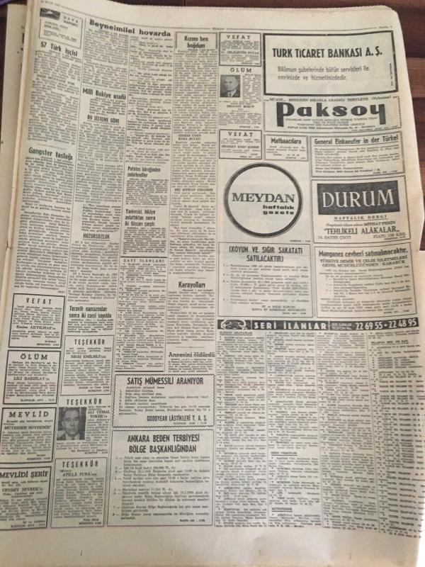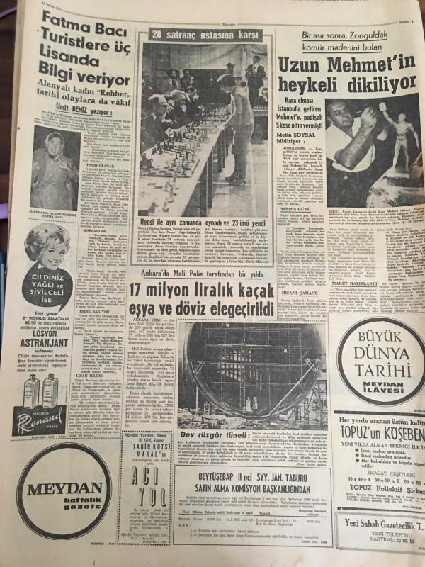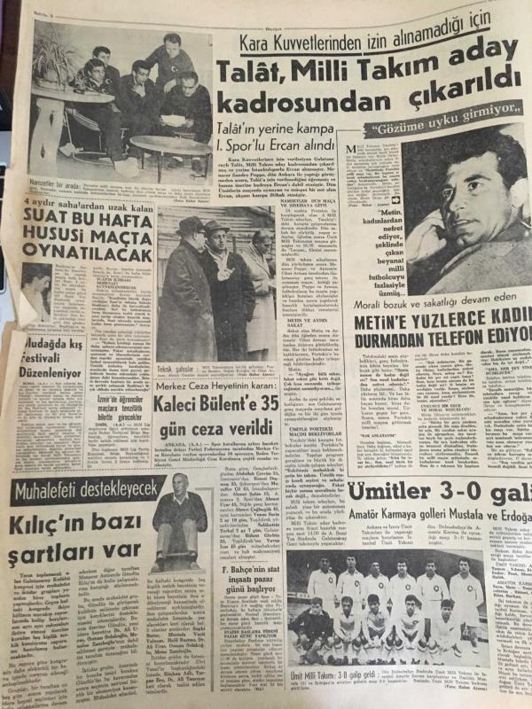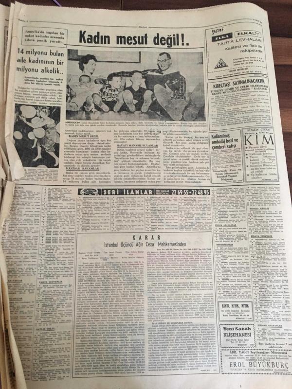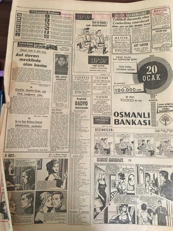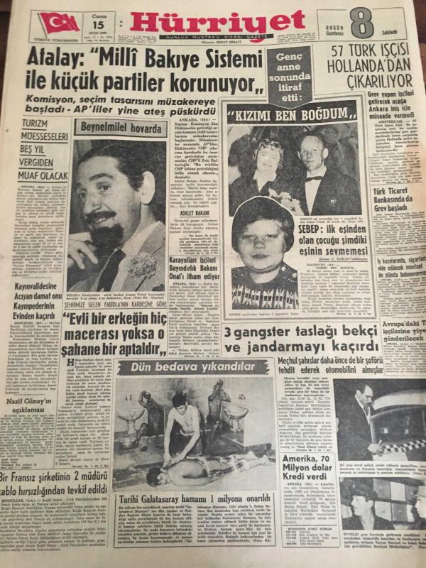 HÜRRİYET GAZETESİ 15 OCAK 1965 YIL :17 SAYI:6004----Atalay :Milli bakiye sistemi ile küçük partililer korunuyor --57 Türk işçisi Hollanda 'dan çıkarılıyor ---Tarihi Galatasaray hamamı 1 milyona onarıldı ----Fatma Bacı Turistlere üç lisanda bilgi veriyor ----17 milyon liralık kaçak eşya ve döviz ele geçirildi---Uzun Mehmet 'in heykeli dikiliyor ----Kara kuvvetlerinden alınmadığı için :Talat , Milli Takım aday kadrosundan çıkarıldı --Suat bu hafta hususi maçta oynatılacak ---Kaleci Bülent 'e 35 gün ceza verildi ---Ümitler 3-0 galip --İstanbul 'lu bir Rum Atina da kaçakçılık suçundan tevkif edildi --Prenses Margaret sosyete veda etti --1965 de kadın güzelliği :Brigitte Bardot --- Yıpranma, sararmalar, kupon kesiği ve yırtılmalar zamana bağlı olarak görülebilir.