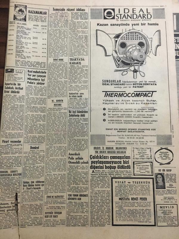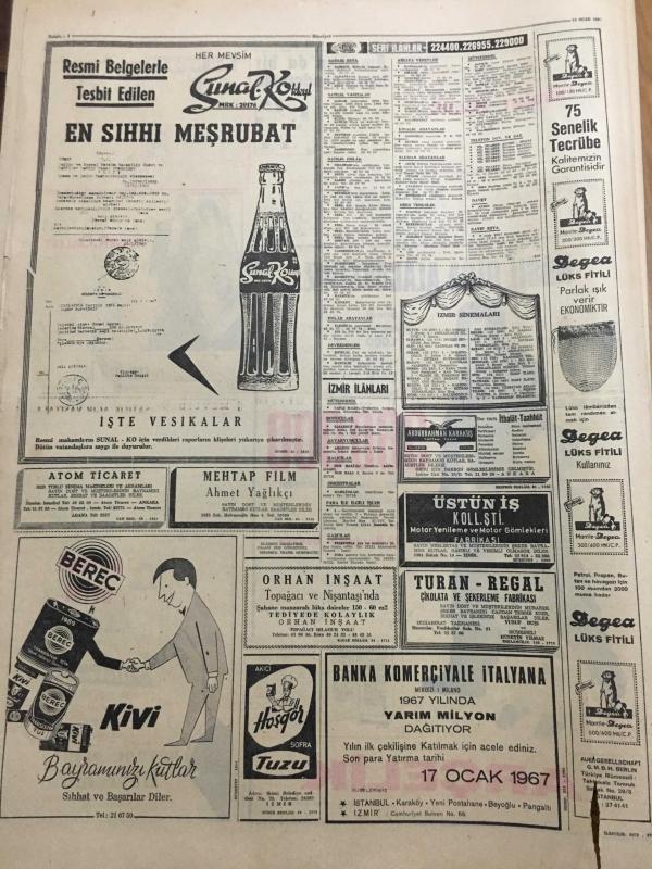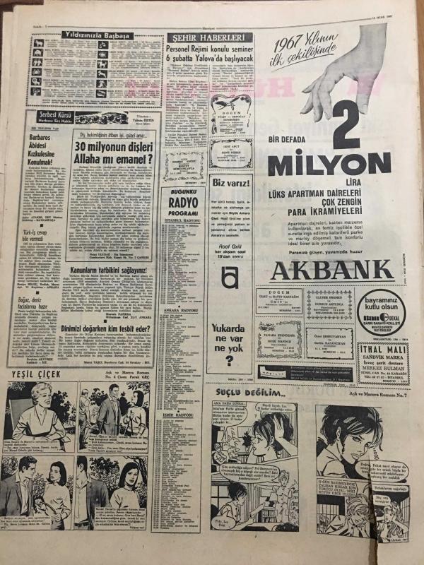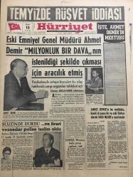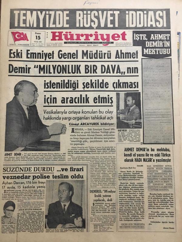 HÜRRİYET GAZETESİ 15 OCAK 1967 YIL :19 SAYI :6722--Eski Emniyet Genel Müdürü Ahmet Demir Milyonluk Bir Dava nın İstenildiği Şekilde Çıkması İçin Aracılık Etmiş ---Sözünde Durdu ve firari veznedar polise teslim oldu ---Demirel :105 milyar liralık yatırım yapılacak dedi ---Personel rejimi konulu seminer 6 Şubat ta Yalova da başlayacak ---Okuma için ideal yaş :6 ---Amerika da bir hasta donduruldu ---Sophia Loren çocuğunu yine düşürdü -- Çaldıkları çamaşırları paylaşmayınca biri diğerini boğup öldürdü ---Fenerbahçe -Göztepe --Galatasaray 2-1 galip ---Beşiktaş -Altınordu karşılaşıyor ---İzm.Spor -Vefa yenişemedi :1-1--Altay I.Spor u 1-0 Yendi ---Ordu Takımı Bugün Irak la Karşılaşacak --- Yıpranma, sararmalar, kupon kesiği ve yırtılmalar zamana bağlı olarak görülebilir.