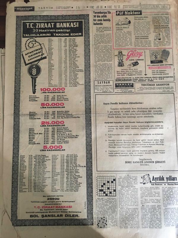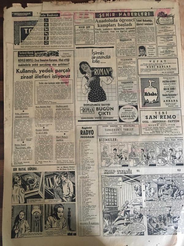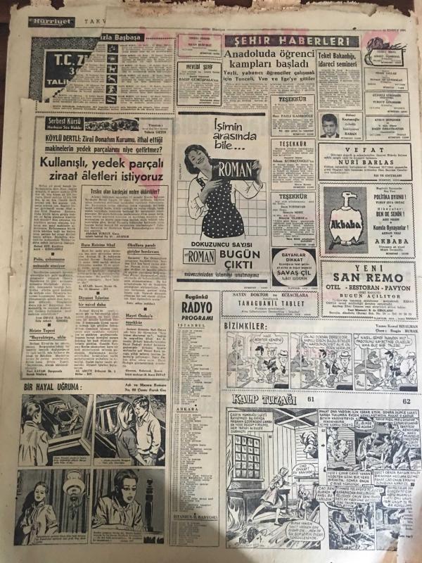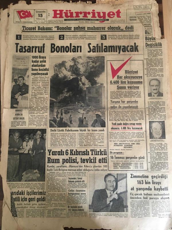 HÜRRİYET GAZETESİ 15 TEMMUZ 1964 YIL :17 SAYI :5820--Tasarruf Bonoları Satılamayacak : 1000 liraya kadar aylık alanlardan bono kesintisi yapılmayacak ---Yaralı 6 Kıbrıslı Türkü Rum Polisi ,Tevkif Etti ---Zimmetine geçirdiği 163 bin lirayı at yarışında kaybetti ---Anadolu öğrenci kampları başladı ---Yarımburgaz da 50 bin yıllık bir çene kemiği bulundu ---Amerika ile soğuk harbe devam edeceğiz en kuvvetli silahımız da Müslümanlık ---Lefter memnun değil --Fiorentina ,Can Lazio ya teklif etti --Beşiktaş :2 Galatasaray : 0--Seçmenleri Sanayi Bakanını Protesto Etti ----Gelin -kaynana kavgasını sonu -- Yıpranma, sararmalar, kupon kesiği ve yırtılmalar zamana bağlı olarak görülebilir.