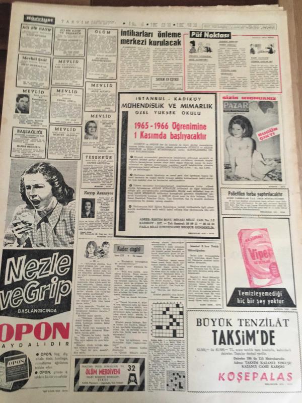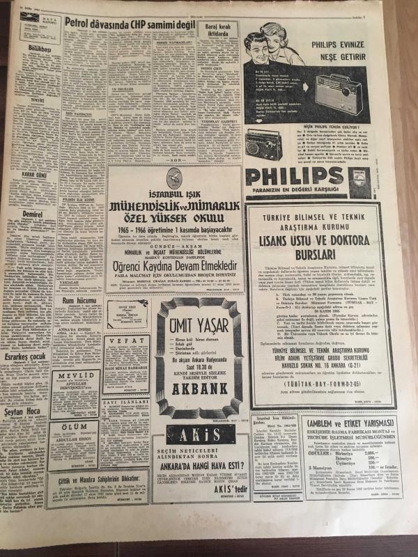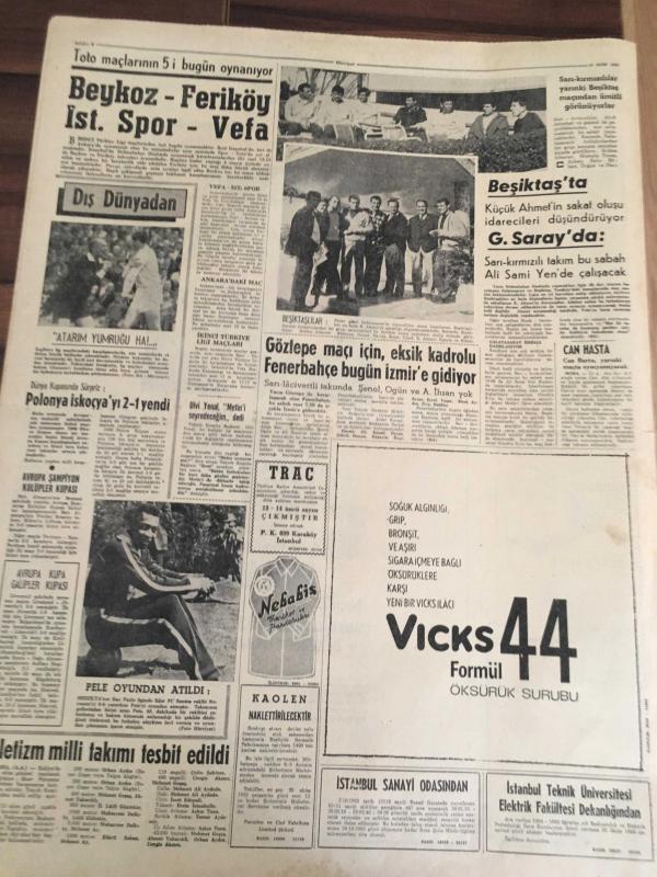 HÜRRİYET GAZETESİ 16 EKİM YIL :18 SAYI :6 P273----Bölükbaşı Millete Küstü ---Demirel Neyin intikamı kimden alınacak --Petrol davasında CHP samimi değil ----Rumlar , Kıbrıs 'ta hücuma başladı --İntiharla önleme merkezi kurulacak ---Fransız kadınları gönüllü casus oldu --Beykoz -Feriköy İst .Spor -Vefa ---Polonya İskoçya 'yı 2-1 yendi ---Göztepe maçı için , eksik kadrolu Fenerbahçe bugün İzmir 'e gidiyor --Atletizm milli takım tesbit edildi --Almanya , Hindistan , Amerika Filmi satın almak istediler ---Hanife Gümüşpala Demirel 'i tebrik etti --- Rumlar , Kıbrıs ta hücuma başladı -- Barajlar kralı iktidarda--- Yıpranma, sararmalar, kupon kesiği ve yırtılmalar zamana bağlı olarak görülebilir.