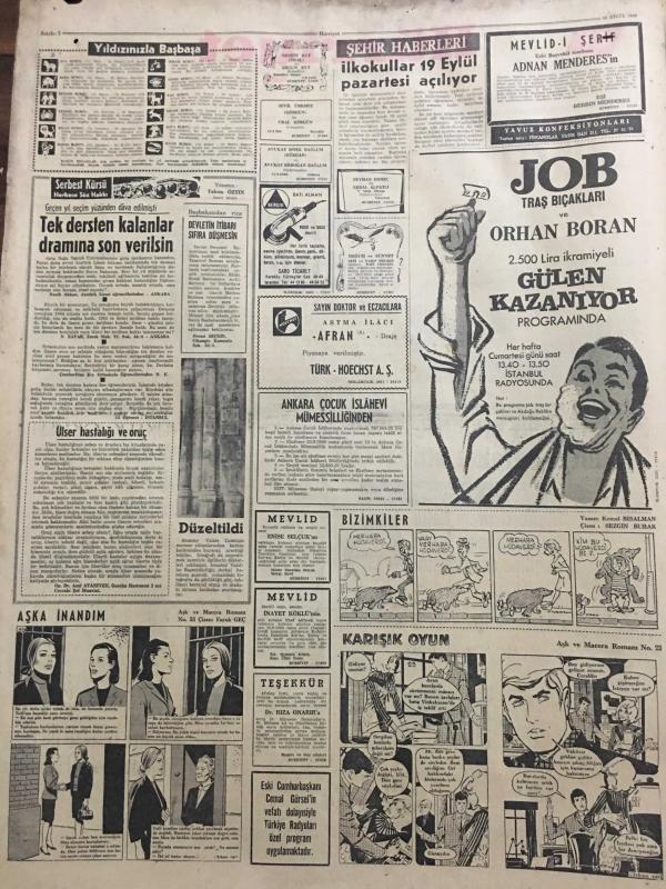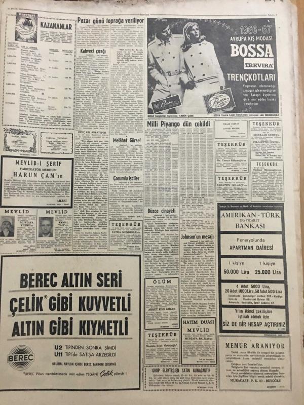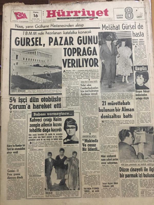 HÜRRİYET GAZETESİ 16 EYLÜL 1966 YIL :19 SAYI :6603--Gürsel ,Pazar Günü Toprağa Veriliyor ---54 İşçi dün otobüsle Çorum a hareket etti ---Melahat Gürsel de hasta ---Kahveci çırağı Naim zengin ailenin kızını tehditle dağa kaçırdı ---Kıbrıs ta Rumlar bir Türk ün otomobilini ateşe verdi ---21 Mürettebatı bulunan bir Alman denizaltısı battı ---Muktedir ve cesur bir liderdi ---Düzce cinayeti ile ilgili bir parmak izi bulundu ---İlkokullar 19 Eylül Pazartesi Açılıyor ---Bir Hostesin Üzerinde 1 Milyon 600 Bin Liralık Kaçak Zümrüt ve Yakut Bulundu ---Beşiktaş Bolusporu 1-0 yendi ---Bu haftaki maçlar tehir edilmiyor ---Spor yapalım dedikodu değil ---30 Yaşındaki Fransız Yüzücü 30-35 Metre Dalabilmektedir --İran la yarın karşılaşacağız ---İzmirspor Fenerbahçe için kampa girdi ---Milli Piyango Dün Çekildi ---Japonlar boş araziye köy kuruyor ---Artık her elmasın nüfus kağıdı var ---Şarkıcı Mina bir oğlu olduktan sonra evli sevgilisinden ayrıldı ---- Yıpranma, sararmalar, kupon kesiği ve yırtılmalar zamana bağlı olarak görülebilir.