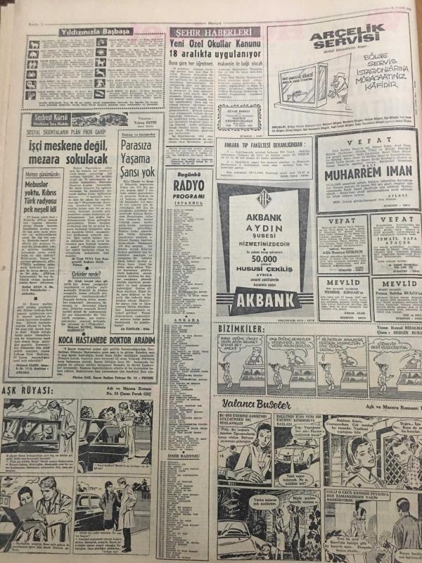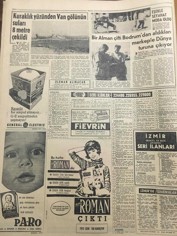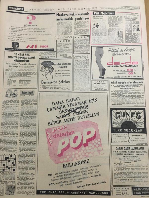 HÜRRİYET GAZETESİ 16 KASIM 1965 YIL :18 SAYI :6304--Çiftçiye açılan kredi miktarı arttırılıyor --Motoru yanan THY uçağında 49 kişi ölüm tehlikesi atlattı ---İngilizce öğretmeni ,işçi olarak Almanya ya gitti ---İngiltere 50 milyon lira kredi teklif etti ---Kalbine saplanan bıçak ile Bayındır dan İzmir e getirilen genç kurtarıldı ---Hafta da 16 saat eğe yapan kızların elleri nasır bağladı --İki eşkiya bir turist çifti kurşun yağmuruna tuttu ---Doğum kontrol ilaç ve araçlarını kullanan 7 bin kadından ancak 5 i gebe kaldı ---35 liraya aldığı taklit broş çalınmış mal çıkınca mahkemelik oldu --Moskova -Pekin arasında anlaşmazlık genişliyor ---Kuraklık yüzünden Van Gölü nün suları 8 metre çekildi --Bir Alman çifti Bodrum dan aldıkları merkeple Dünya turuna çıkıyor ---Futbolculara para cezası ---Beşiktaş ı kolay kolay tutamazlar --Clay artık konuşmuyor --Patterson ,koca ayıdan çok daha iyi bir boksör ---Ulaştırma Bakanı Kadro değil zihniyet değiştireceğiz dedi --- Yıpranma, sararmalar, kupon kesiği ve yırtılmalar zamana bağlı olarak görülebilir.