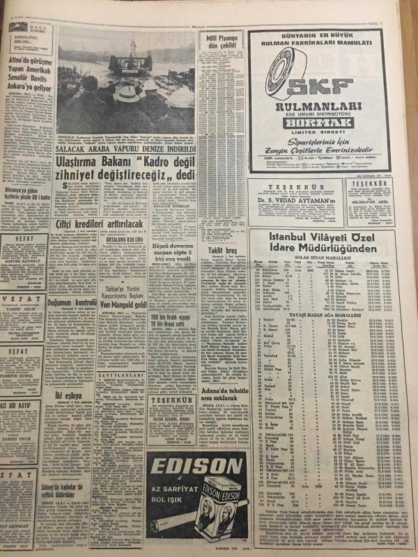 HÜRRİYET GAZETESİ 16 KASIM 1965 YIL :18 SAYI :6304--Çiftçiye açılan kredi miktarı arttırılıyor --Motoru yanan THY uçağında 49 kişi ölüm tehlikesi atlattı ---İngilizce öğretmeni ,işçi olarak Almanya ya gitti ---İngiltere 50 milyon lira kredi teklif etti ---Kalbine saplanan bıçak ile Bayındır dan İzmir e getirilen genç kurtarıldı ---Hafta da 16 saat eğe yapan kızların elleri nasır bağladı --İki eşkiya bir turist çifti kurşun yağmuruna tuttu ---Doğum kontrol ilaç ve araçlarını kullanan 7 bin kadından ancak 5 i gebe kaldı ---35 liraya aldığı taklit broş çalınmış mal çıkınca mahkemelik oldu --Moskova -Pekin arasında anlaşmazlık genişliyor ---Kuraklık yüzünden Van Gölü nün suları 8 metre çekildi --Bir Alman çifti Bodrum dan aldıkları merkeple Dünya turuna çıkıyor ---Futbolculara para cezası ---Beşiktaş ı kolay kolay tutamazlar --Clay artık konuşmuyor --Patterson ,koca ayıdan çok daha iyi bir boksör ---Ulaştırma Bakanı Kadro değil zihniyet değiştireceğiz dedi ---, SEDAT SİMAVİ tarafından kaleme alınmıştır. Kitap 1965 yılında [HÜRRİYET MATBAA] yayınlanmıştır. 8 sayfadır. HÜRRİYET GAZETESİ 16 KASIM 1965 YIL :18 SAYI :6304--Çiftçiye açılan kredi miktarı arttırılıyor --Motoru yanan THY uçağında 49 kişi ölüm tehlikesi atlattı ---İngilizce öğretmeni ,işçi olarak Almanya ya gitti ---İngiltere 50 milyon lira kredi teklif etti ---Kalbine saplanan bıçak ile Bayındır dan İzmir e getirilen genç kurtarıldı ---Hafta da 16 saat eğe yapan kızların elleri nasır bağladı --İki eşkiya bir turist çifti kurşun yağmuruna tuttu ---Doğum kontrol ilaç ve araçlarını kullanan 7 bin kadından ancak 5 i gebe kaldı ---35 liraya aldığı taklit broş çalınmış mal çıkınca mahkemelik oldu --Moskova -Pekin arasında anlaşmazlık genişliyor ---Kuraklık yüzünden Van Gölü nün suları 8 metre çekildi --Bir Alman çifti Bodrum dan aldıkları merkeple Dünya turuna çıkıyor ---Futbolculara para cezası ---Beşiktaş ı kolay kolay tutamazlar --Clay artık konuşmuyor --Patterson ,koca ayıdan çok daha iyi bir boksör ---Ulaştırma Bakanı Kadro değil zihniyet değiştireceğiz dedi --- adlı eser Türkçe dilindedir.
