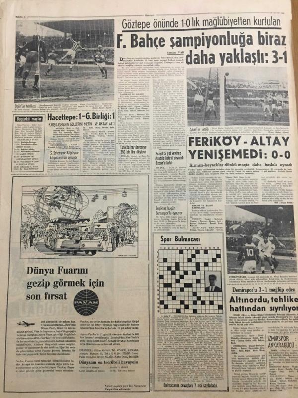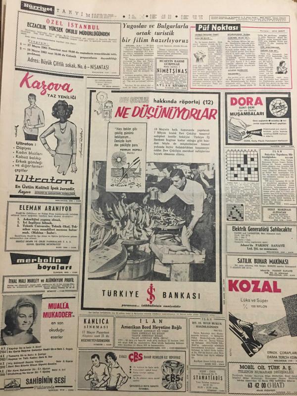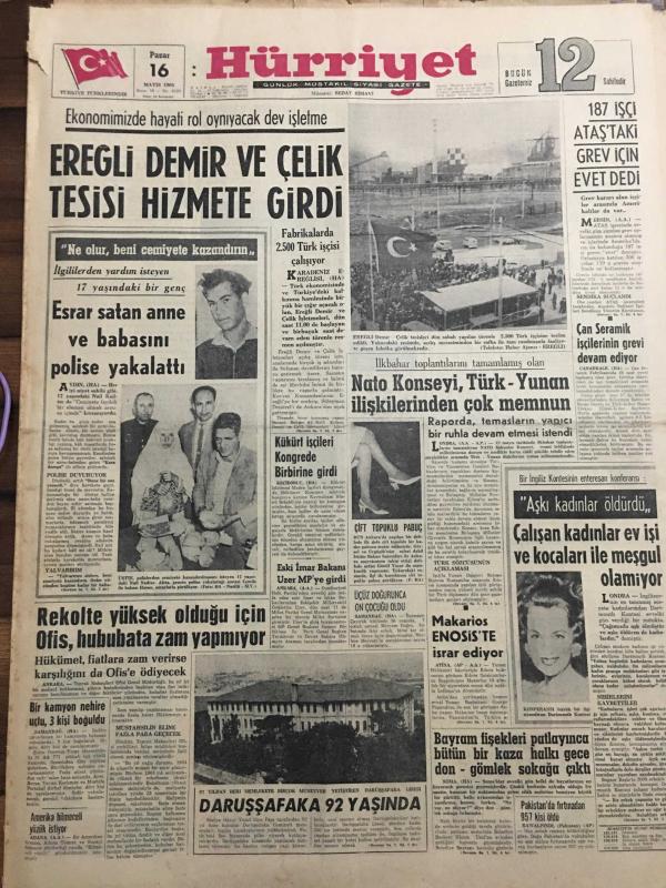 HÜRRİYET GAZETESİ 16 MAYIS 1965 YIL :18 SAYI :6120---Ereğli Demir ve Çelik Tesisi Hizmete Girdi ---Esrar satan anne ve babasını polise yakalattı ---Rekolte yüksek olduğu için ofis hububata zam yapmıyor ---Nato Konseyi ,Türk -Yunan ilişkilerinden çok memnun ---Kükürt işçileri kongrede birbirine girdi ---Daruşşafaka 92 Yaşında ----Bayram fişekleri patlayınca bütün bir kaza halkı gece don -gömlek sokağa çıkmadı --Çalışan kadınlar ev işi ve kocaları ile meşgul olamıyor ---Cinsiyet konusunda uçurumun eşiğindeyiz ---Bugoslav ve Bulgarlarla ortk ortak turistik bir film hazırlıyoruz ---Mualla Mukadder :En son okuduğu eserler ---Sinema Yıldızlarına Plak Doldurdu :Ajda Pekkan ,Suzan Avcı ,Çetin Altıner ,Vahi Öz ,Neriman Köksal ---Fenerbahçe şampiyonluğa biraz daha yaklaştı :3-1---Hacettepe :1 -G.Birliği :1 ----Feriköy -Altay yenişemedi :0-0--Altınordu , tehlike hattından sıyrılıyor --Makarios Enosis te israr ediyor ---Çan Seramik İşçilerinin Grevi Devam Ediyor --- Yıpranma, sararmalar, kupon kesiği ve yırtılmalar zamana bağlı olarak görülebilir.