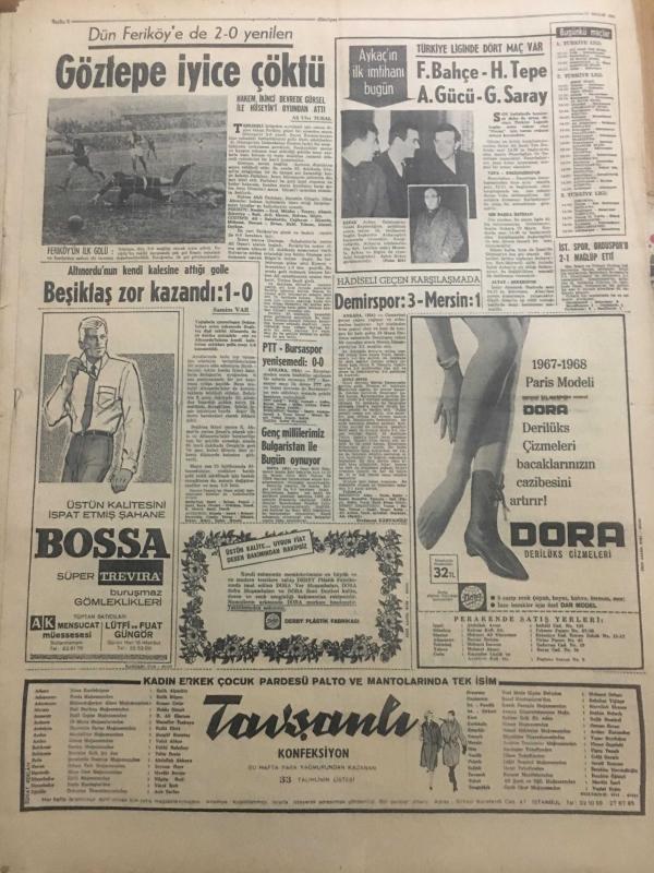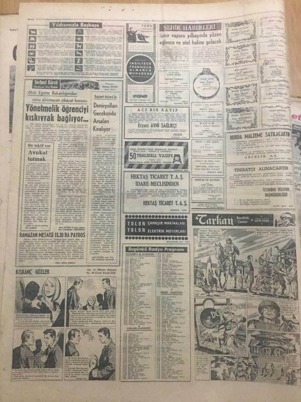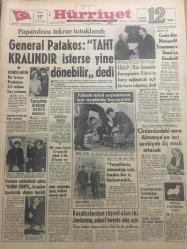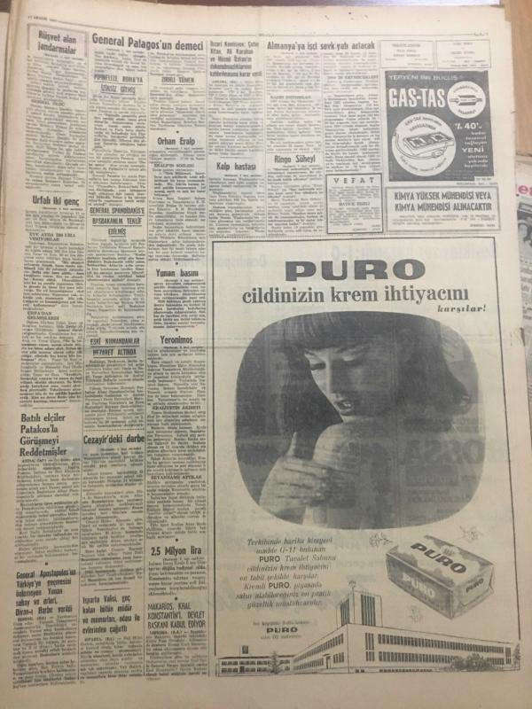 HÜRRİYET GAZETESİ 17 ARALIK 1967 YIL :20 SAYI :7055---General Patakos :Taht Kralındır İsterse yine dönebilir dedi ---Yunanistan kraliçesi bebek bekliyor --Kızlara sarkıntılık eden Ringo Süheyl in saçları karakolda dipten kesildi ---Eralp :Biz güvenlik konseyinden Kıbrıs ta barışı sağlayacak açık bir karar istiyoruz dedi ---Önümüzdeki sene Almanya ya işçi sevkiyatı üç misli artacak ---Torpilimiz olmadığı için başka bir iş bulamadık ---Kaçakçılardan rüşvet alan iki jandarma askeri heyete ateş açtı ---Şöhret hepsini şımarık bir varlık haline getirmiş --Sigara kadınları çirkinleştiriyor --Rusya da 50 kilo altın çalan bir maden mühendisi idam edildi --280 kiloluk Orkinos 5.5 saatlik mücadeleden sonra yakalandı --Göztepe iyice çöktü --Beşiktaş zor kazandı :1-0 --Fenerbahçe -H.Tepe A.Gücü-Galatasaray ---Demirspor :3 -Mersin :1 ---Cunta dün Metropolit Yeronimos u Roma ya gönderdi --Cezayir de ki darbe teşebbüsünde birçok kişi öldü ---Bir asma köprü 75 vasıta ile çöktü ,5 ölü 21 kayıp Yıpranma, sararmalar, kupon kesiği ve yırtılmalar zamana bağlı olarak görülebilir.