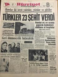 HÜRRİYET GAZETESİ 17 KASIM 1967 YIL :20 SAYI :7025--Rumlar iki köyü yaktılar ,yıktılar ve gittiler ---Türkler 23 Şehit Verdi --Geri dönmeseydik batacaktık ---Hükümetin Bombardımanı Kararı Tatbik Edilemedi ---Kabadayı kardeşleri korkutmağa giden 62 lik otelci ,annelerini öldürdü ----Yeşilköy hava alanı 5 saat iç ve dış trafiğe kapatıldı ---TBMM gizli toplantı yaptı ----Hitlerin son Gestapo şefi de yakalandı---55 milyonla liraya aldığımız dev Türk Bayrağı çekildi ---Göztepe bombardımana hazır ---Antrenörle idareciler suçu birbirinin üzerine atıyor --Fenerbahçe stadı 5 işçi ile bitirilmeğe çalışıyor --Galatasaray şeytanın ayağını bu hafta kıracak ---Türkiye Kupasında ,PTT Trabzon u Kura ile Eledi ---Öz kardeş gibiler ---Yedi köyün yedi kızı ---Denktaş :İşgal olayı beklenen bir neticedir ---Papadopulos : Bu hadiselerde bizim muvafakatimiz yoktur diyor ----TBMM gizli toplantı yapıyor -- adlı eser, Kitap > Süreli Yayınlar > Gazeteler > Türkiye > Genel > Günlük kategorisinde İkinci El olarak satıştadır.