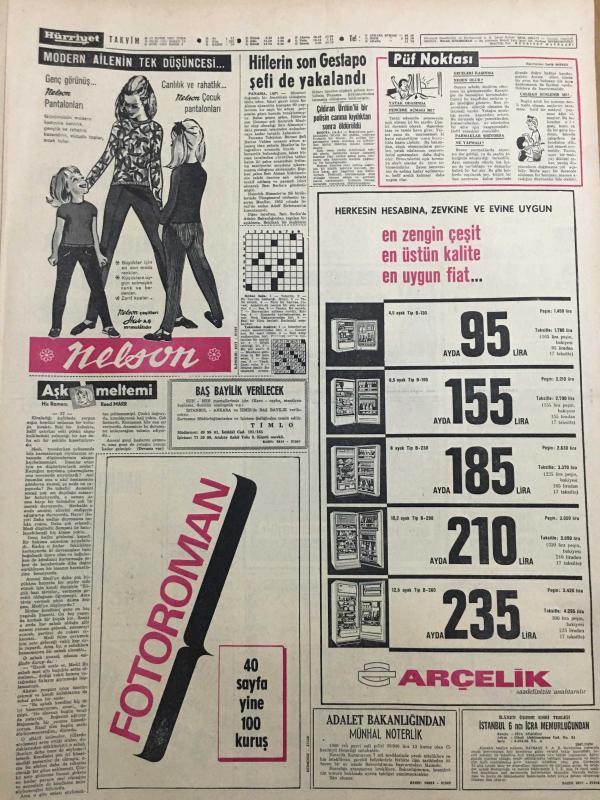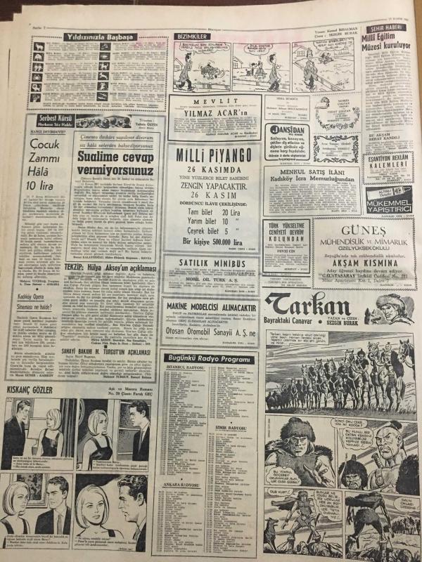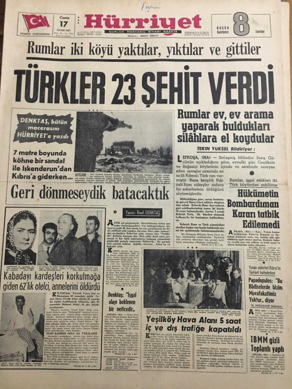 HÜRRİYET GAZETESİ 17 KASIM 1967 YIL :20 SAYI :7025--Rumlar iki köyü yaktılar ,yıktılar ve gittiler ---Türkler 23 Şehit Verdi --Geri dönmeseydik batacaktık ---Hükümetin Bombardımanı Kararı Tatbik Edilemedi ---Kabadayı kardeşleri korkutmağa giden 62 lik otelci ,annelerini öldürdü ----Yeşilköy hava alanı 5 saat iç ve dış trafiğe kapatıldı ---TBMM gizli toplantı yaptı ----Hitlerin son Gestapo şefi de yakalandı---55 milyonla liraya aldığımız dev Türk Bayrağı çekildi ---Göztepe bombardımana hazır ---Antrenörle idareciler suçu birbirinin üzerine atıyor --Fenerbahçe stadı 5 işçi ile bitirilmeğe çalışıyor --Galatasaray şeytanın ayağını bu hafta kıracak ---Türkiye Kupasında ,PTT Trabzon u Kura ile Eledi ---Öz kardeş gibiler ---Yedi köyün yedi kızı ---Denktaş :İşgal olayı beklenen bir neticedir ---Papadopulos : Bu hadiselerde bizim muvafakatimiz yoktur diyor ----TBMM gizli toplantı yapıyor -- Yıpranma, sararmalar, kupon kesiği ve yırtılmalar zamana bağlı olarak görülebilir.