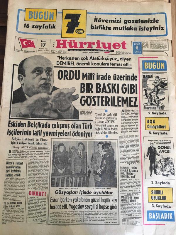 HÜRRİYET GAZETESİ 17 KASIM 1968 YIL :21 SAYI :7386--Herkesten çok Atatürkçüyüz diyen Demirel önemli konulara temas etti -----Ordu Milli İrade Üzerinde Bir Baskı gibi Gösterilemez ---Eskiden Belçika da çalışmış olan Türk işçilerinin tatil yevmiyeleri ödeniyor ---Esrar içerken yakalanan güzel İngiliz kızı beraat etti ,Yugoslav sevgilisi hapse girdi ---İtalya da haydutlar dağa kaldırdıkları zengin bir iş adamını 5 milyon fidye alıp serbest bıraktı ---Fenerbahçe sırat köprüsünde ---Galatasaraylı Ergün Fehmi ile bacanak oldu --Beşiktaş İzmir de Altınordu ile oynuyor ---Vefa ,G.Birliği önünde kayboldu :3-1---İstanbulspor Göztepe yi 3-1 mağlup etti ---Şekerspor :2 İzmirspor :0----Altay ,D.Spor a galip geldi ---Nixon a suikast sanıklarından biri kefaletle tahliye edildi ---Başbakan :Boğaz Köprüsü İstanbul a Değil Türkiye ye Hizmettir Dedi ---Gaziantep te hayat normale döndü ----, SEDAT SİMAVİ tarafından kaleme alınmıştır. Kitap 1968 yılında [HÜRRİYET MATBAA] yayınlanmıştır. 8 sayfadır. HÜRRİYET GAZETESİ 17 KASIM 1968 YIL :21 SAYI :7386--Herkesten çok Atatürkçüyüz diyen Demirel önemli konulara temas etti -----Ordu Milli İrade Üzerinde Bir Baskı gibi Gösterilemez ---Eskiden Belçika da çalışmış olan Türk işçilerinin tatil yevmiyeleri ödeniyor ---Esrar içerken yakalanan güzel İngiliz kızı beraat etti ,Yugoslav sevgilisi hapse girdi ---İtalya da haydutlar dağa kaldırdıkları zengin bir iş adamını 5 milyon fidye alıp serbest bıraktı ---Fenerbahçe sırat köprüsünde ---Galatasaraylı Ergün Fehmi ile bacanak oldu --Beşiktaş İzmir de Altınordu ile oynuyor ---Vefa ,G.Birliği önünde kayboldu :3-1---İstanbulspor Göztepe yi 3-1 mağlup etti ---Şekerspor :2 İzmirspor :0----Altay ,D.Spor a galip geldi ---Nixon a suikast sanıklarından biri kefaletle tahliye edildi ---Başbakan :Boğaz Köprüsü İstanbul a Değil Türkiye ye Hizmettir Dedi ---Gaziantep te hayat normale döndü ---- adlı eser Türkçe dilindedir.