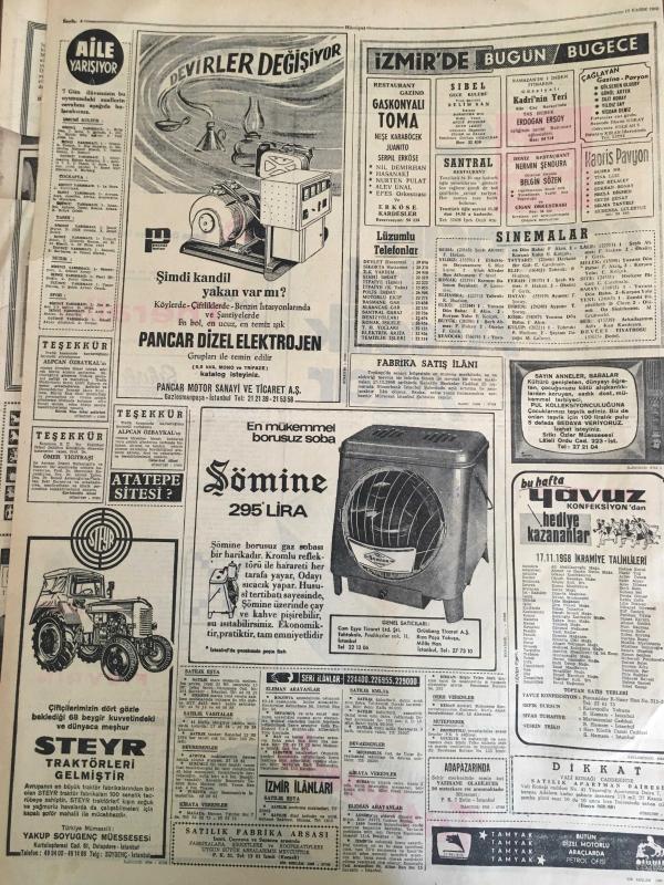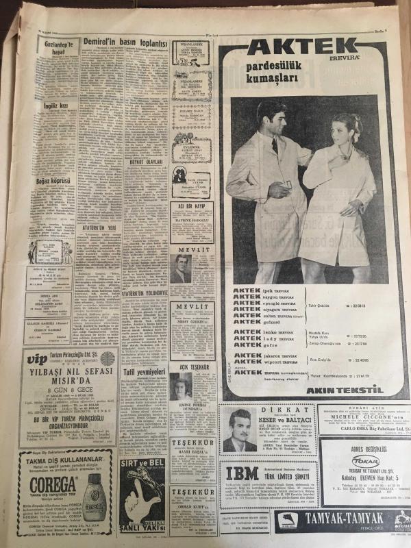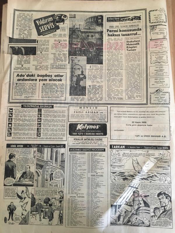 HÜRRİYET GAZETESİ 17 KASIM 1968 YIL :21 SAYI :7386--Herkesten çok Atatürkçüyüz diyen Demirel önemli konulara temas etti -----Ordu Milli İrade Üzerinde Bir Baskı gibi Gösterilemez ---Eskiden Belçika da çalışmış olan Türk işçilerinin tatil yevmiyeleri ödeniyor ---Esrar içerken yakalanan güzel İngiliz kızı beraat etti ,Yugoslav sevgilisi hapse girdi ---İtalya da haydutlar dağa kaldırdıkları zengin bir iş adamını 5 milyon fidye alıp serbest bıraktı ---Fenerbahçe sırat köprüsünde ---Galatasaraylı Ergün Fehmi ile bacanak oldu --Beşiktaş İzmir de Altınordu ile oynuyor ---Vefa ,G.Birliği önünde kayboldu :3-1---İstanbulspor Göztepe yi 3-1 mağlup etti ---Şekerspor :2 İzmirspor :0----Altay ,D.Spor a galip geldi ---Nixon a suikast sanıklarından biri kefaletle tahliye edildi ---Başbakan :Boğaz Köprüsü İstanbul a Değil Türkiye ye Hizmettir Dedi ---Gaziantep te hayat normale döndü ---- Yıpranma, sararmalar, kupon kesiği ve yırtılmalar zamana bağlı olarak görülebilir.