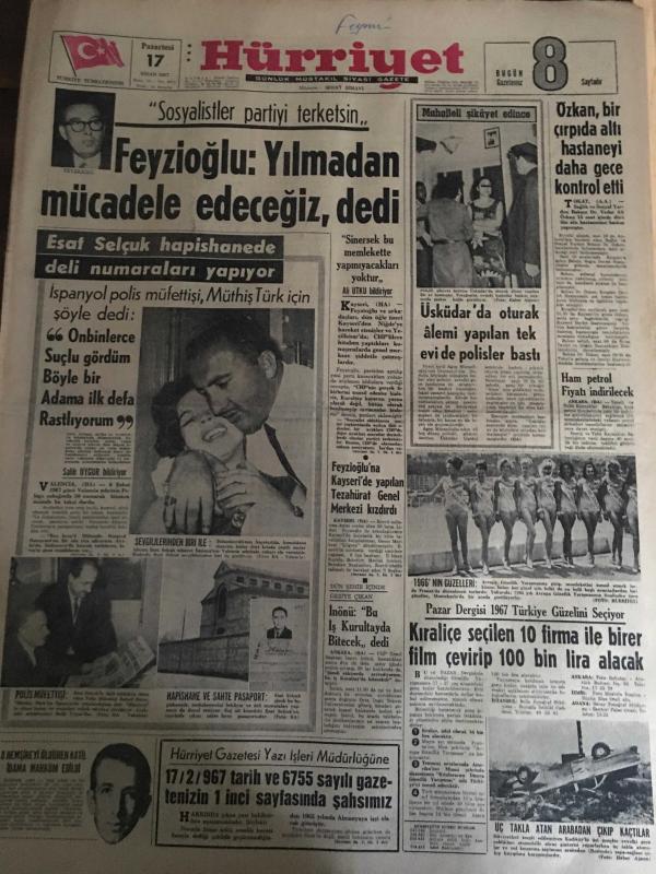 HÜRRİYET GAZETESİ 17 NİSAN 1967 YIL :19 SAYI :6811--Feyzioğlu :Yılmadan mücadele edeceğiz dedi --Esat Selçuk hapishanede deli numaraları yapıyor : On binlerce suçlu gördüm böyle bir adama ilk defa rastlıyorum --Özkan ,bir çırpıda altı hastaneyi daha gece kontrol etti ---Üskidar da oturak alemi yapılan tek evi de polisler bastı ---Feyzioğlu na Kayseri de yapılan tezahürat genel merkezi kızdırdı ---Kraliçe seçilen 10 firma ile birer film çevirip 100 bin lira alacak --İnönü : Bu iş kurultay da bitecek dedi ---Ham petrol fiyatlarını indirilecek ---İngiliz kızlarını satan bir şebeke varmış ---Altay ,Fenerbahçe yi de yendi :2-1--Beşiktaş :0 PTT :0 --Galatasaray :0 Ankaragücü :0--İstanbul spor : 0 Demirspor :0--Şevket ustanın yaptığı altın kaplama alem İstanbul un üstüne yerleşti --8 Hemşireyi öldüren katil idama mahkum edildi --, SEDAT SİMAVİ tarafından kaleme alınmıştır. Kitap 1967 yılında [HÜRRİYET MATBAA] yayınlanmıştır. 8 sayfadır. HÜRRİYET GAZETESİ 17 NİSAN 1967 YIL :19 SAYI :6811--Feyzioğlu :Yılmadan mücadele edeceğiz dedi --Esat Selçuk hapishanede deli numaraları yapıyor : On binlerce suçlu gördüm böyle bir adama ilk defa rastlıyorum --Özkan ,bir çırpıda altı hastaneyi daha gece kontrol etti ---Üskidar da oturak alemi yapılan tek evi de polisler bastı ---Feyzioğlu na Kayseri de yapılan tezahürat genel merkezi kızdırdı ---Kraliçe seçilen 10 firma ile birer film çevirip 100 bin lira alacak --İnönü : Bu iş kurultay da bitecek dedi ---Ham petrol fiyatlarını indirilecek ---İngiliz kızlarını satan bir şebeke varmış ---Altay ,Fenerbahçe yi de yendi :2-1--Beşiktaş :0 PTT :0 --Galatasaray :0 Ankaragücü :0--İstanbul spor : 0 Demirspor :0--Şevket ustanın yaptığı altın kaplama alem İstanbul un üstüne yerleşti --8 Hemşireyi öldüren katil idama mahkum edildi -- adlı eser Türkçe dilindedir.