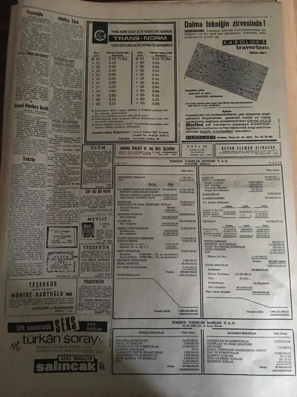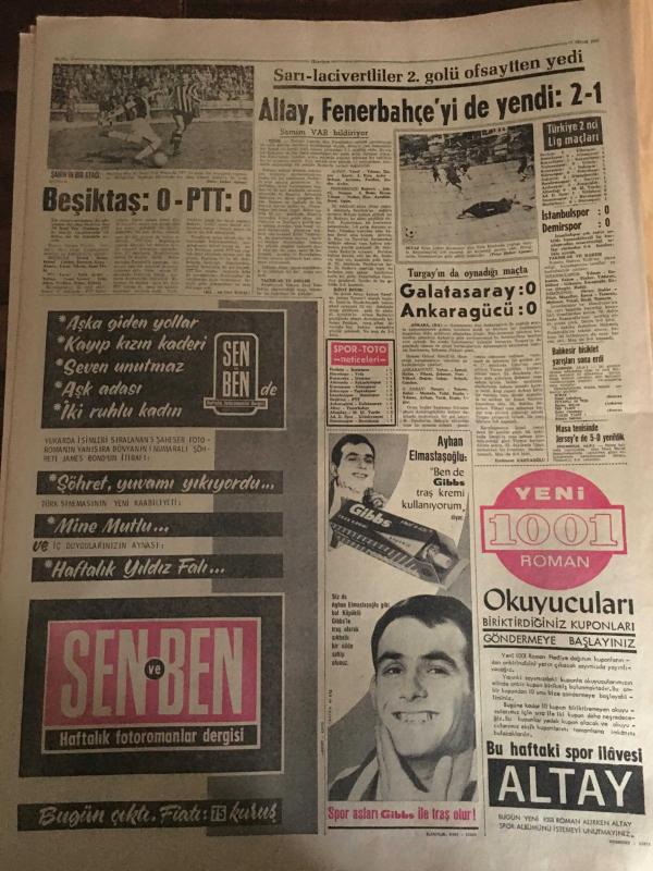 HÜRRİYET GAZETESİ 17 NİSAN 1967 YIL :19 SAYI :6811--Feyzioğlu :Yılmadan mücadele edeceğiz dedi --Esat Selçuk hapishanede deli numaraları yapıyor : On binlerce suçlu gördüm böyle bir adama ilk defa rastlıyorum --Özkan ,bir çırpıda altı hastaneyi daha gece kontrol etti ---Üskidar da oturak alemi yapılan tek evi de polisler bastı ---Feyzioğlu na Kayseri de yapılan tezahürat genel merkezi kızdırdı ---Kraliçe seçilen 10 firma ile birer film çevirip 100 bin lira alacak --İnönü : Bu iş kurultay da bitecek dedi ---Ham petrol fiyatlarını indirilecek ---İngiliz kızlarını satan bir şebeke varmış ---Altay ,Fenerbahçe yi de yendi :2-1--Beşiktaş :0 PTT :0 --Galatasaray :0 Ankaragücü :0--İstanbul spor : 0 Demirspor :0--Şevket ustanın yaptığı altın kaplama alem İstanbul un üstüne yerleşti --8 Hemşireyi öldüren katil idama mahkum edildi -- adlı eser, Kitap > Süreli Yayınlar > Gazeteler > Türkiye > Genel > Günlük kategorisinde İkinci El olarak satıştadır.