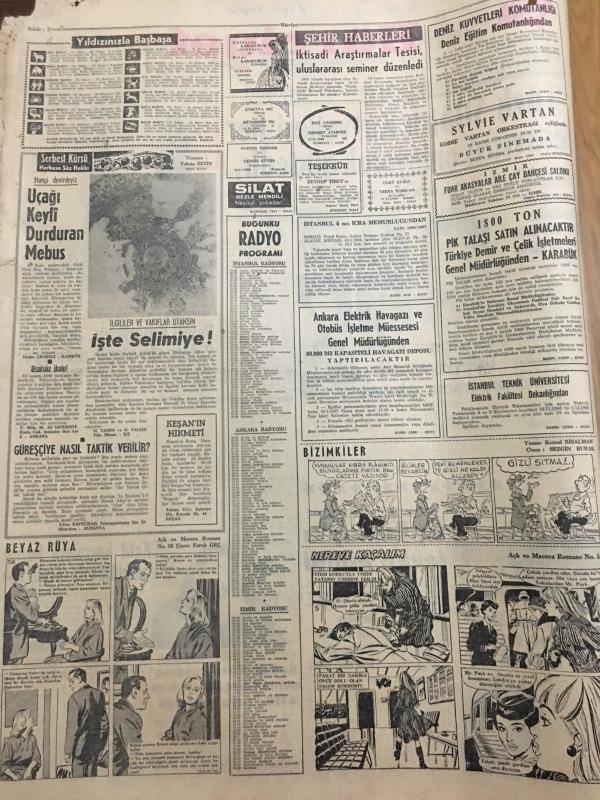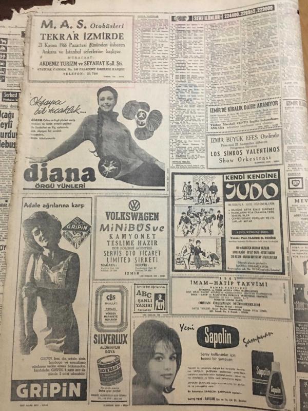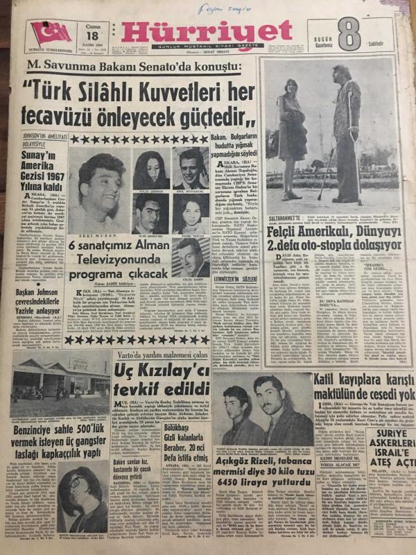 HÜRRİYET GAZETESİ 18 KASIM 1966 YIL :19 SAYI :6666--Türk Silahlı Kuvvetleri her tecavüzü önleyecek güçtedir --Sunay ın Amerika Gezisi 1967 Yılına Kaldı ---6 Sanatçımız Alman Televizyonunda Programa Çıkacak ---Felçli Amerikalı ,Dünyayı 2. Defa Oto-Stopla Dolaşıyor ---Üç Kızılay cı tevkif edildi ---Benzinciye sahte 500 lük vermek isteyen üç gangster taslağı kapkaççılık yaptı ----Katil kayıplara karıştı maktülünde cesedi yok --Açıkgöz Rizeli ,tabanca mermisi diye 30 kilo tuzu 6450 liraya yutturdu ---Suriye de ki askerleri İsrail e ateş açtı ----Tam dokuz hapishanede yattıktan sonra beraat etti ---Türk Takımının Oturmuş Bir Sistemi Yok ---Türk takımında futbolu iyi bilen oyuncular var ---Başbakan ın çağrısı :Daha az yemek yiyin ---Faysal ın oğlu 8 milyon liraya özel jet uçağı aldı ---Gülen bebek kolu indirilince gözünden yaşlar boşanıyor --Beyaz Saray ın damat adayı üç yıl sonra asker oluyor --Alkış yerine tabak kırma adeti yayılıyor --- Yıpranma, sararmalar, kupon kesiği ve yırtılmalar zamana bağlı olarak görülebilir.