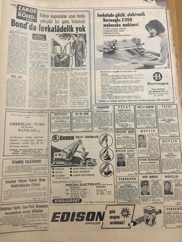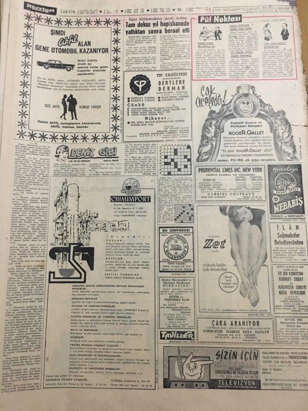 HÜRRİYET GAZETESİ 18 KASIM 1966 -Banyo zevki”PURO”Sabun --Türk Silahlı Kuvvetleri her tecavüzü önleyecek güçtedir --Sunay ın Amerika Gezisi 1967 Yılına Kaldı --Zeki Müren,Erol Büyükburç,Nuri Sesigüzel-6 Sanatçımız Alman Televizyonunda Programa Çıkacak ---Felçli Amerikalı ,Dünyayı 2. Defa Oto-Stopla Dolaşıyor ---Üç Kızılay cı tevkif edildi ---Benzinciye sahte 500 lük vermek isteyen üç gangster taslağı kapkaççılık yaptı ----Katil kayıplara karıştı maktülünde cesedi yok --Açıkgöz Rizeli ,tabanca mermisi diye 30 kilo tuzu 6450 liraya yutturdu ---Suriye de ki askerleri İsrail e ateş açtı ----Tam dokuz hapishanede yattıktan sonra beraat etti ---Türk Takımının Oturmuş Bir Sistemi Yok ---Türk takımında futbolu iyi bilen oyuncular var ---Başbakan ın çağrısı :Daha az yemek yiyin ---Faysal ın oğlu 8 milyon liraya özel jet uçağı aldı ---Gülen bebek kolu indirilince gözünden yaşlar boşanıyor --Beyaz Saray ın damat adayı üç yıl sonra asker oluyor --Alkış yerine tabak kırma adeti yayılıyor ---, SEDAT SİMAVİ tarafından kaleme alınmıştır. Kitap 1967 yılında [HÜRRİYET MATBAA] yayınlanmıştır. 8 sayfadır. HÜRRİYET GAZETESİ 18 KASIM 1966 -Banyo zevki”PURO”Sabun --Türk Silahlı Kuvvetleri her tecavüzü önleyecek güçtedir --Sunay ın Amerika Gezisi 1967 Yılına Kaldı --Zeki Müren,Erol Büyükburç,Nuri Sesigüzel-6 Sanatçımız Alman Televizyonunda Programa Çıkacak ---Felçli Amerikalı ,Dünyayı 2. Defa Oto-Stopla Dolaşıyor ---Üç Kızılay cı tevkif edildi ---Benzinciye sahte 500 lük vermek isteyen üç gangster taslağı kapkaççılık yaptı ----Katil kayıplara karıştı maktülünde cesedi yok --Açıkgöz Rizeli ,tabanca mermisi diye 30 kilo tuzu 6450 liraya yutturdu ---Suriye de ki askerleri İsrail e ateş açtı ----Tam dokuz hapishanede yattıktan sonra beraat etti ---Türk Takımının Oturmuş Bir Sistemi Yok ---Türk takımında futbolu iyi bilen oyuncular var ---Başbakan ın çağrısı :Daha az yemek yiyin ---Faysal ın oğlu 8 milyon liraya özel jet uçağı aldı ---Gülen bebek kolu indirilince gözünden yaşlar boşanıyor --Beyaz Saray ın damat adayı üç yıl sonra asker oluyor --Alkış yerine tabak kırma adeti yayılıyor --- adlı eser Türkçe dilindedir.