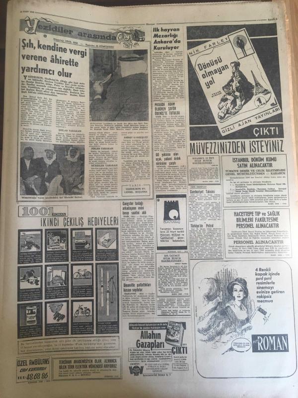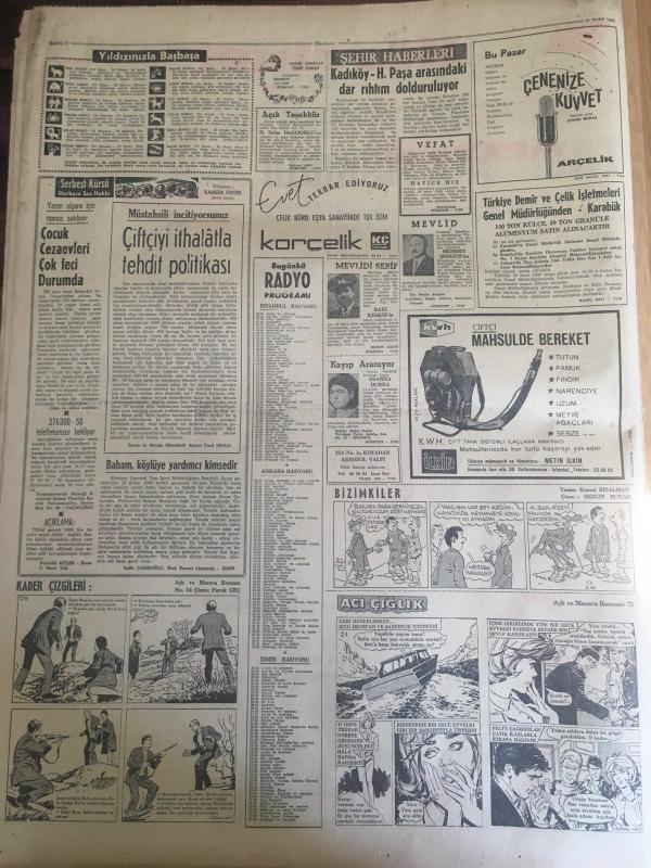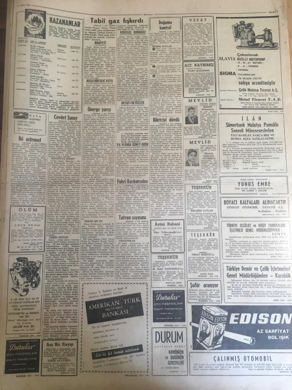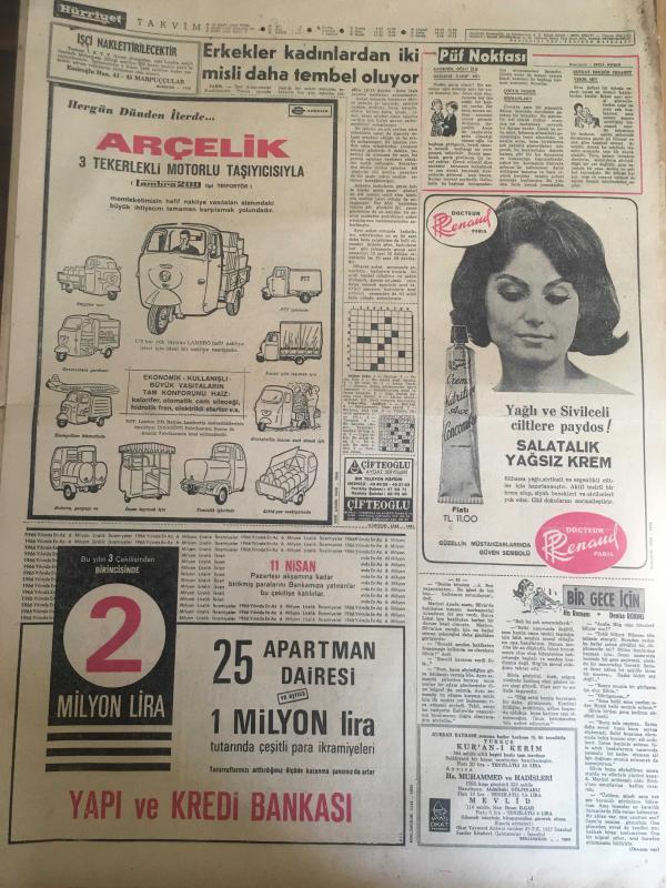 HÜRRİYET GAZETESİ 18 MART 1966 YIL :18 SAYI :6424---Tabii Gaz Fışkırdı ---Sunay And için Senatörlük Görevine Başladı ---Muhalefet önerge verme yarışına devam ediyor ---Danimarka kralı Mithat nemli ye teşekkürleriyle birlikte bir de nişan verdi ----2 Astronot mecburi iniş yaptı --Gebeliği önleyici hap 750 kuruştan dün satışa çıkarıldı ---Kadıköy -H.Paşa arasında ki dar rıhtım dolduruluyor ---Erkekler kadınlardan iki misli daha tembel oluyor ---Milli Takımımız bugün yurda dönüyor :İran Gazeteleri kendi takımlarını methediyor ---Beşiktaşlı Futbolcular 4350 lira aldı --Yenal neticeden memnun olmadı ---İdealist grup listesini tespit etti ---Türkiye Kayak Birincilikleri Nihayet Başladı ---Zevk için başladığı olta balıkçılığından günde 50 lira alıyor ---Erkek arkadaşıyla gezen kadına beş zorba tecavüz etti --Amerikalı Barış Gönüllüsü Kız Pasosuna Alan Biletçiyi Dövdü ---Jandarma Tatvan soygununu prestij meselesi yaptı ---Sunay ın emekli aylığı 2160 lira --- Yıpranma, sararmalar, kupon kesiği ve yırtılmalar zamana bağlı olarak görülebilir.